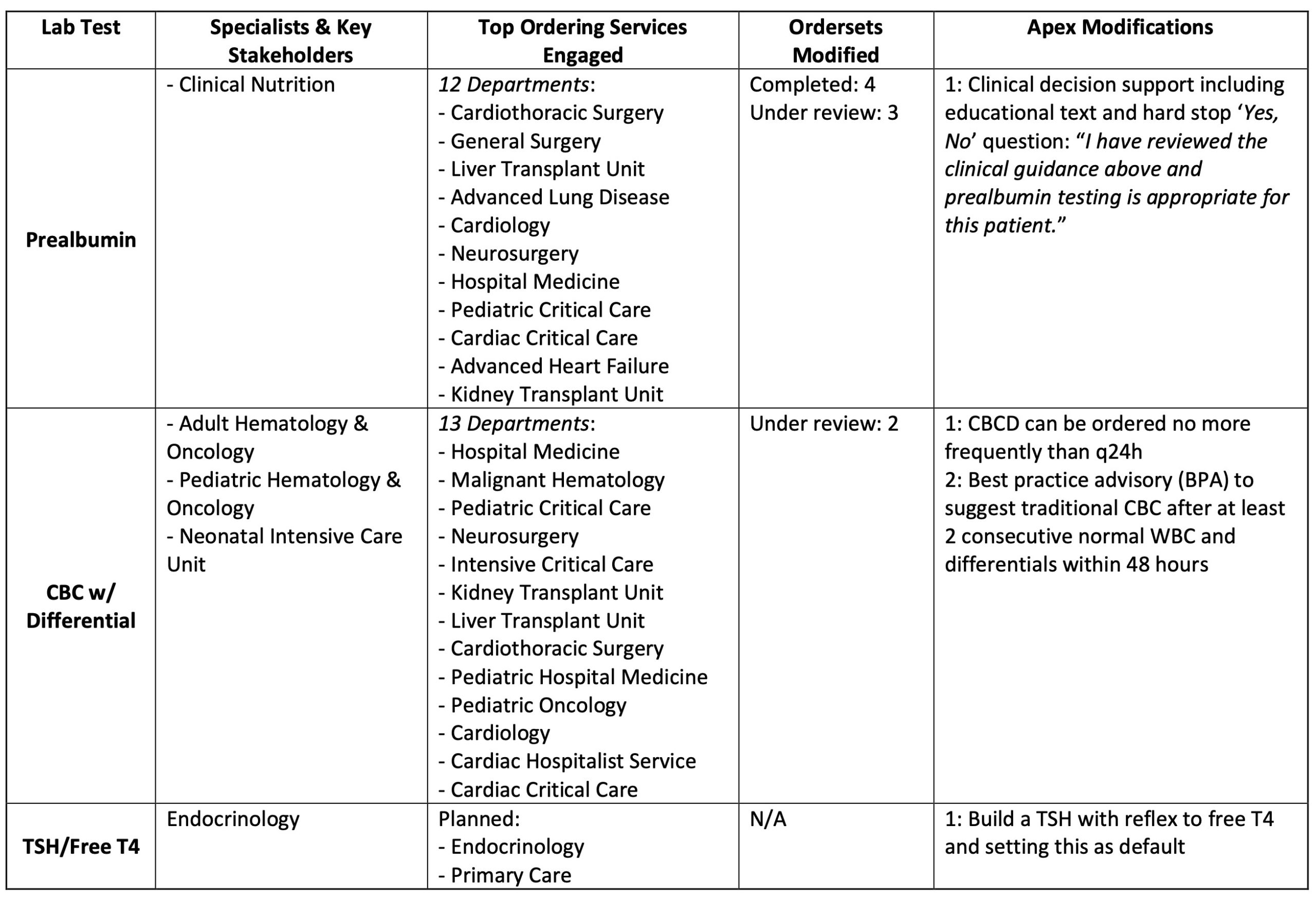Conclusions: We implemented a comprehensive lab stewardship program and piloted interventions to reduce unnecessary testing for 3 target tests. This process included establishing lab stewardship governance infrastructure, developing a framework to identify opportunities for safe reduction, and creating replicable processes to engage stakeholders, deliver educational content, deploy EHR modifications, and measure the impact of these interventions. This established infrastructure and successful pilot have created the foundation to assess impact and scale our program to identify and address additional opportunities to improve lab stewardship at our institution.