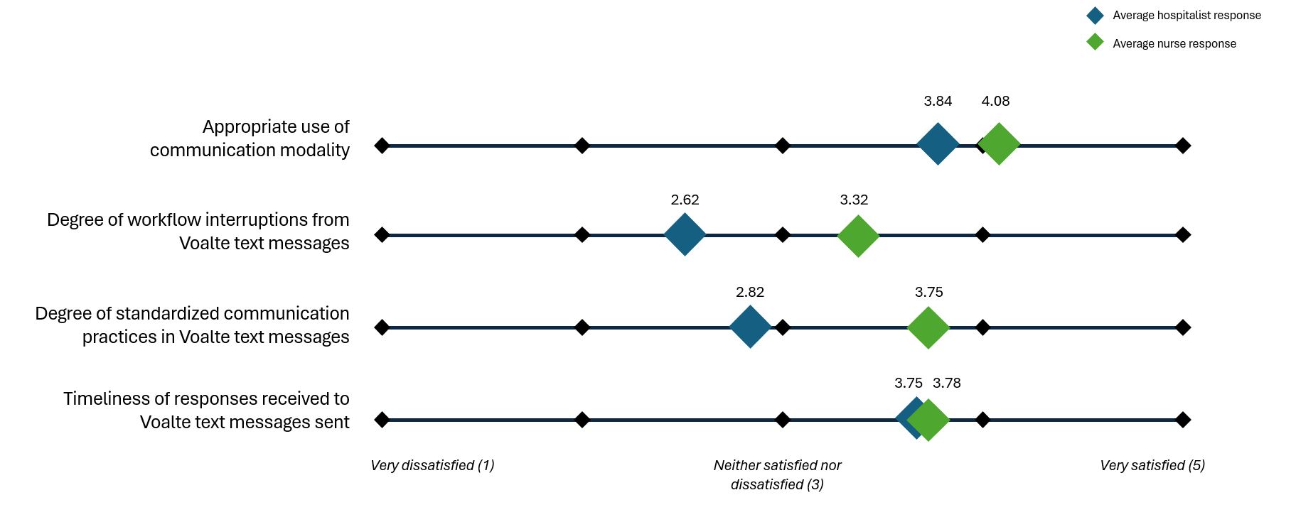 Background: Secure text messaging systems that allow for bidirectional communication between a sender and recipient, instead of relying on unidirectional alphanumeric text or numeric-only messages, have fundamentally changed inpatient communications. At our institution, all clinical team members utilize the same secure messaging platform (Voalte). We aimed to explore physician and nurse overall satisfaction with our institution’s current secure messaging system and to identify factors that may be contributing to dissatisfaction among hospitalists and bedside nurses.