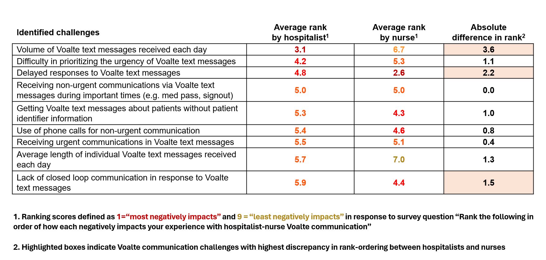 Methods: Via email listservs, we administered a survey to hospitalists and medicine unit nurses at our large, urban, academic institution. Survey questions were developed based on prior focus groups and semi-structured interviews conducted to identify existing challenges with physician-nurse communication. The survey included Likert-scaled questions exploring respondents’ overall satisfaction with the secure message system as well as with specific communication domains. Respondents were asked to rank-order various factors that impact their experiences with physician-nurse communication. All survey responses were anonymous.
