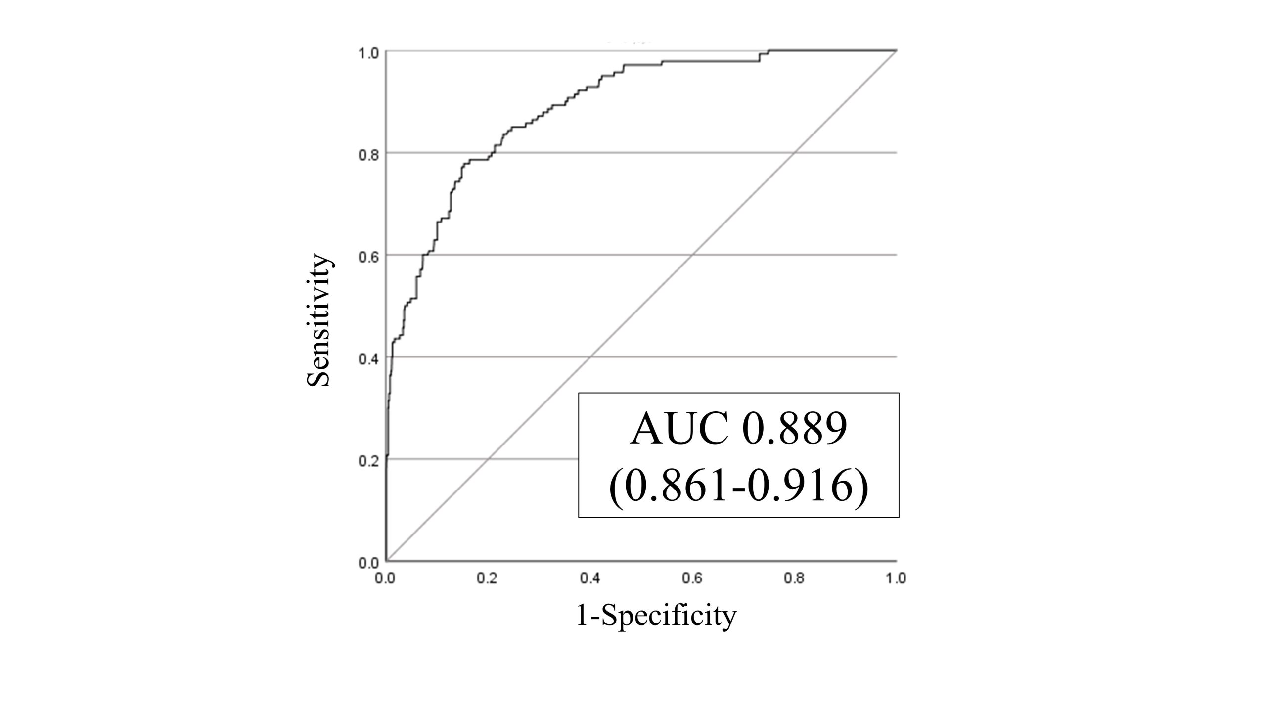 Results: A total of 1,182 patients were included in the analysis. The median age was 86 years, and 45.5% were male. The median length of hospital stay was 27 days. A total of 140 falls occurred (11.8%), with an incidence rate of 4.4 per 1,000 patient-days. Within the fall group, the median age was 88 years, 79.3% were male, and the median length of hospital stay was 68 days. SFRM-2 exhibited an AUC of 0.889 (95% confidence interval: 0.861-0.916) (Figure 2), consistent with the actual incidence of falls, with a shrinkage coefficient of 0.975. The cut-off score for SFRM-2 on the Youden index was -2.14, with a sensitivity of 77.9%, specificity of 84.7%, positive predictive value of 40.6%, and negative predictive value of 96.6%.