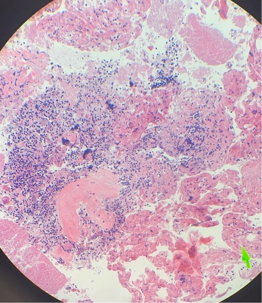 Case Presentation: A 22-year-old woman presented after an episode of syncope and chest pain. The patient reported weight loss and anorexia for 2 weeks and fever, fatigue, and chills for a few days prior to presentation. She had recently moved to Georgia from Missouri. She had no significant medical or family history. Initial workup showed a 4.5 cm sub-carinal mass encasing the pulmonary artery and causing pulmonary stenosis. Initial echocardiogram was normal, but she subsequently developed a moderate pericardial effusion during the next few weeks. Bronchoscopy with endobronchial biopsy (EBUS) was performed twice in addition to video-assisted thoracoscopic surgery with mediastinal biopsy of the mass and surrounding lymph nodes. Pathologic examination revealed necrotizing granulomatous inflammation with negative bacterial, fungal, AFB cultures, and negative cytology and flow cytometry.During the second bronchoscopy with EBUS, the patient was given 4 mg of dexamethasone pre-procedurally. Clinical improvement was noted for the next 24-48 hours. We hypothesized that dexamethasone decreased immune activation after suspected infection with histoplasmosis given her previous residence in Missouri. Itraconazole and prednisone were initiated to empirically treat for histoplasmosis. Around the time of treatment initiation, a urinalysis showed proteinuria and microscopic hematuria. Rheumatologic workup resulted cytoplasmic-antineutrophil cytoplasmic antibody (C-ANCA) positive with immunofixation titers of 1:320, serine proteinase 3 markedly positive at 640, and rheumatoid factor >200. Urinary sediment under phase contrast microscopy showed many red blood cells (RBC); 60% had dysmorphic features. During her hospital stay, the patient developed dermatologic manifestations including delayed pressure urticaria of the extremities that resolved with steroids and intermittent vasculitic rash in the lower extremities. With evidence of glomerulonephritis, vasculitic rash, and serologies positive for C-ANCA and serine proteinase-3 in the setting of necrotizing granulomatous inflammation, a primary diagnosis of GPA was made. Histoplasmosis with subsequent immune activation was considered in the diagnostic process, but GPA was favored as a diagnosis considering positive serologic testing and multiorgan manifestations. Itraconazole was discontinued with initiation of pulse dose steroids and rituximab. There was clinical improvement with initial steroid treatment including resolution of pericardial effusion as well as improvement of generalized symptoms. Subsequent evaluation of glomerulonephritis and mediastinal mass were planned for the outpatient setting.