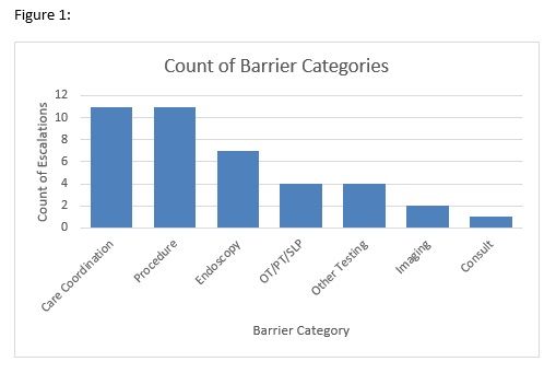 Description: An email address and pager were set up to receive information regarding barriers to patient care progression from the 8 general medicine teams and that would be monitored and responded by clinical leadership of the general medicine service. To aid the general medicine clinical leadership in their responses, a resource guide was developed by hospital leadership to identify a point person in key departments that would be responsible for helping to address barriers to patient care progression brought forward through the GMS Escalate pathway. The types of barriers that were escalated were recorded (Figure 1) as well as the response time, percent with positive resolution, and approximate bed hours saved. During the first 8 weeks of the program, 41 issues were escalated of which 35 (85%) were deemed in scope. Seventy-six percent of escalations were sent between 9am – 5pm, during which the response time was 1.1 hours. The mean response time to escalations sent between 5pm-9AM was 1.4 hours. Fifty-one percent of escalations were able to be escalated with a positive resolution, while another 34% resolved through normal workflows without additional escalation. The escalations resulted in an estimated 240 bed hours saved for the institution. The intervention was positively received by providers.