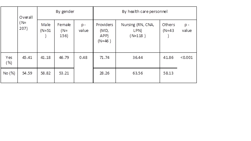Results: 207 personnel were randomly and anonymously observed. 54.6% of study personnel did not comply with hand hygiene, out of them 43.3% failed to perform hand hygiene at both entry and exiting patient’s room, 46.9% at entry and 9.7% at exit. Prevalence of non-compliance was similar among male (58.8%) and female (53.2%) (p-value 0.48). Only 28.3% providers (MD and APP) found to have non-compliance to hand hygiene compared to 63.5% in nursing and 58.1% in other personnel (p-value <0.001). Hands full supplies or medicine and frequent entry and exit were two top reasons for non-compliance (33.8% and 14.1% respectively). 19.7% did not have any valid reason. Lastly, there was a difference in observation between infection prevention department (70-85%) and our study. The falsely elevated rate in adherence rate from infection prevention department could be due to Hawthorne Effect so subjects would show positive behavior when they know they are being monitored.