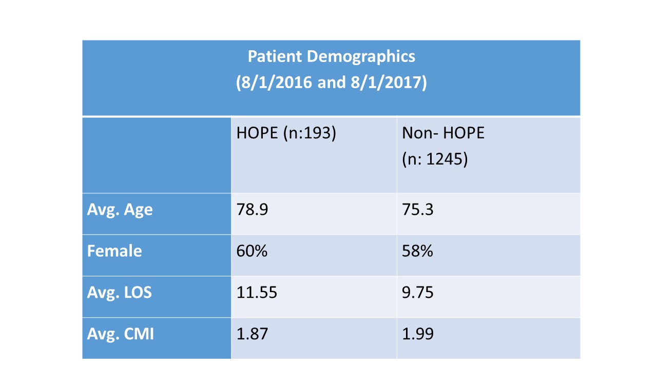 Methods: Patients age 55 and older, discharged from the hospital to post-acute care rehab in a skilled nursing facility (SNF) were eligible for a HOPE consultation. An experienced geriatrics nurse practitioner evaluated each inpatient HOPE patient with the goal of identifying and treating geriatric syndromes, setting appropriate expectations for SNF care with patients/care givers, assessing rehabilitation potential, initiating discussion on contingency plans if rehab goals are unmet, and discussing goals of care. Consultation recommendations were communicated to the primary team and incorporated into discharge planning prior to patient discharge. Post-discharge follow-up within 1 week was conducted by the APP via a phone call or more often, a visit to the SNF. During this follow-up an APP reviewed and discussed high risk/new medications, rehabilitation participation, and appointments/labs/hospital recommendations with SNF medical staff. The study compared readmission rates for all Medicine/Surgery patients in our hospital with and without HOPE consultation who were 55 years or older and discharged to SNF between August 2016 – August 2017.
