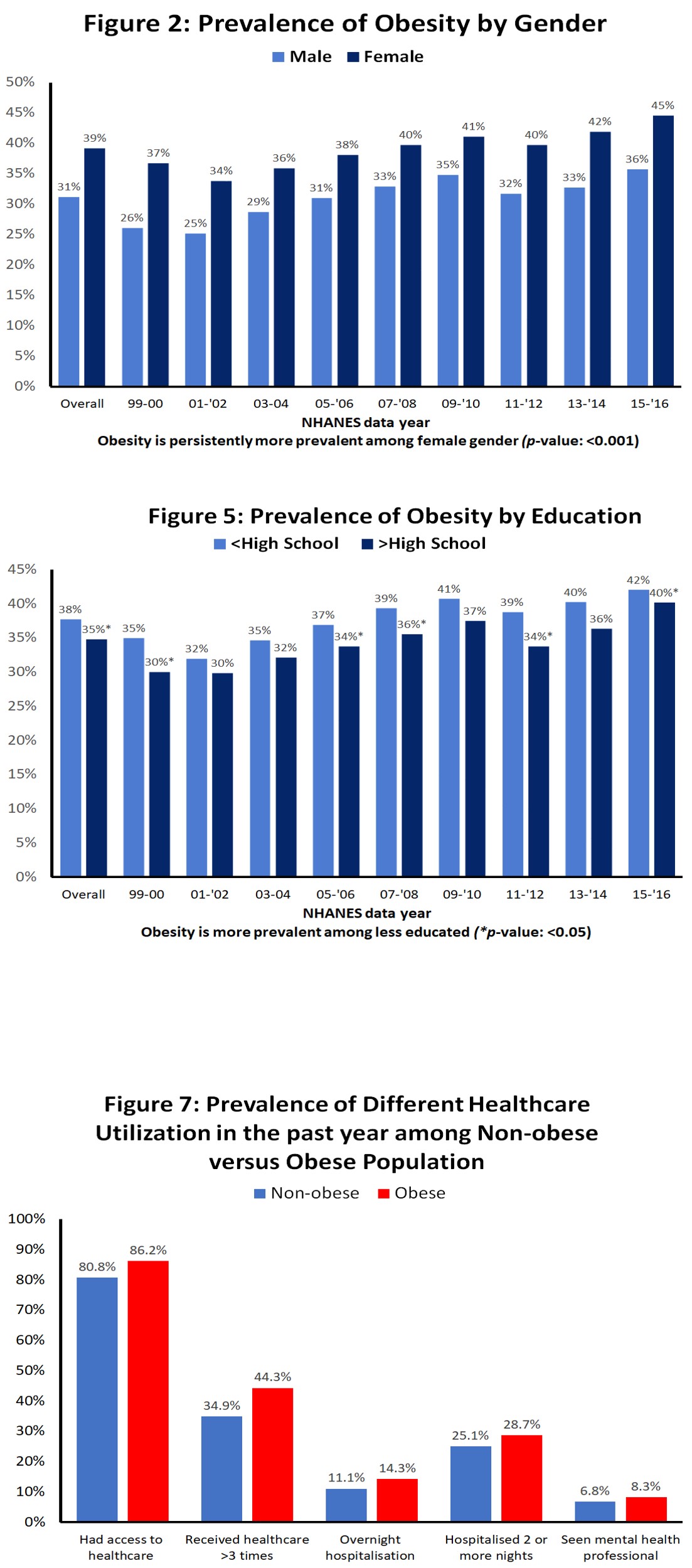 Results: Surprisingly, overall prevalence (36.0%) of this disease is higher among insured individuals compared to un-insured (33.1%) and this trend is similar among different gender and race. Some hypothesis behind this is, most likely population who have healthcare access are much more reluctant to take care of their health and thus are not worried about gaining weight and associated comorbidities. 86.2 % among obese population has a place to go for healthcare access, which is more than non-obese (80.8%). While main source of healthcare is through PCP (68.9%) among obese, these people are 23% more likely to be hospitalized for 2 or more nights compared to non-obese. Impressively, 86.8% of obese population have insight of being obese and 90.1% want to weigh less.
