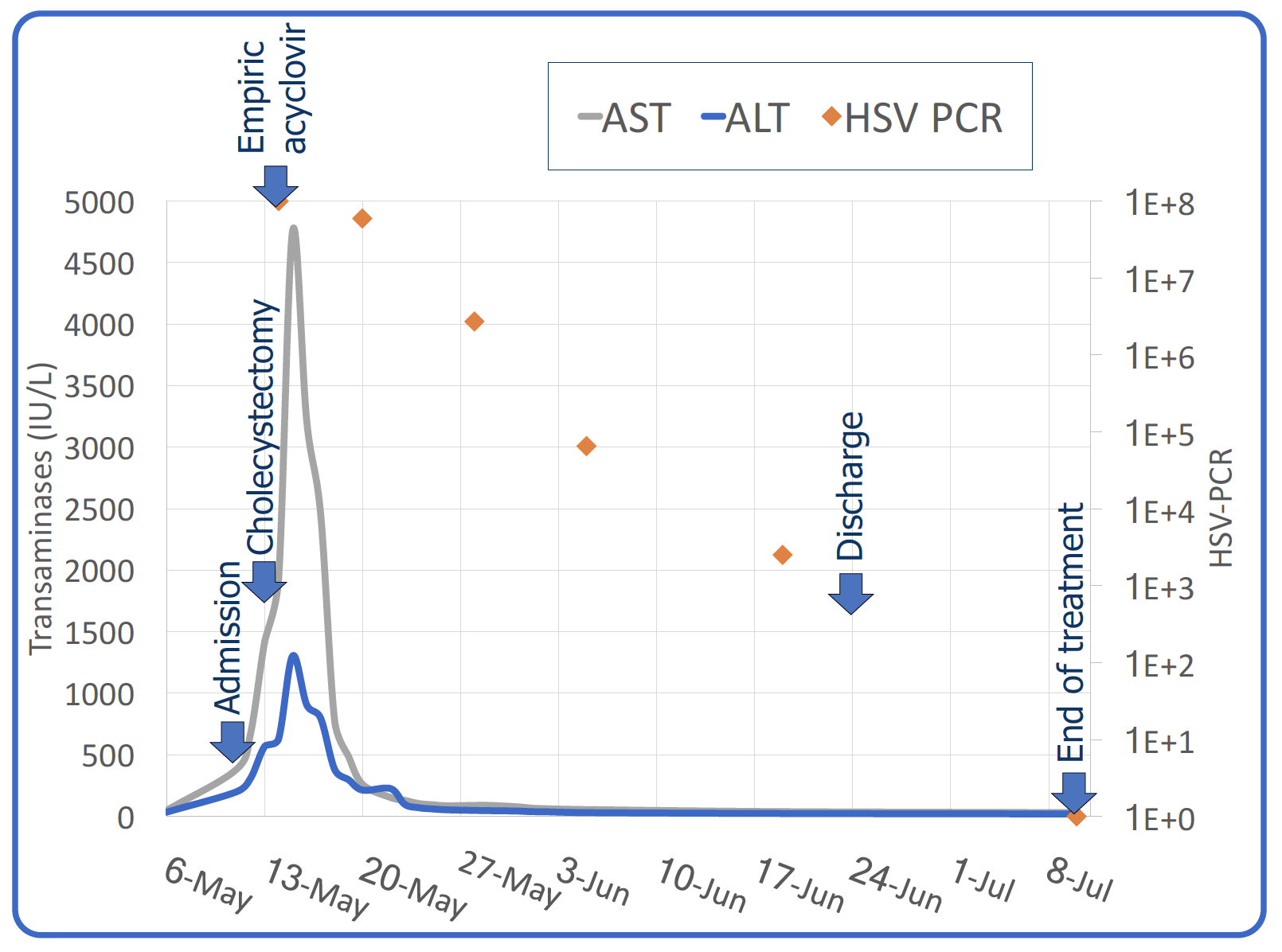 Despite delivery, she remained clinically unstable and her transaminitis worsened (AST:1986, ALT:662). Herpes simplex virus (HSV) hepatitis was suspected, and acyclovir was initiated. A serum HSV PCR returned positive at >1×10^8 copies/mL. The remainder of her infectious and autoimmune workup was negative. She clinically improved on acyclovir, corresponding to rapid improvement in her viremia. She was discharged home on day 29 to complete 6 weeks of IV acyclovir followed by 8 additional weeks of valacyclovir. Her daughter was empirically treated and had an uncomplicated postnatal course.