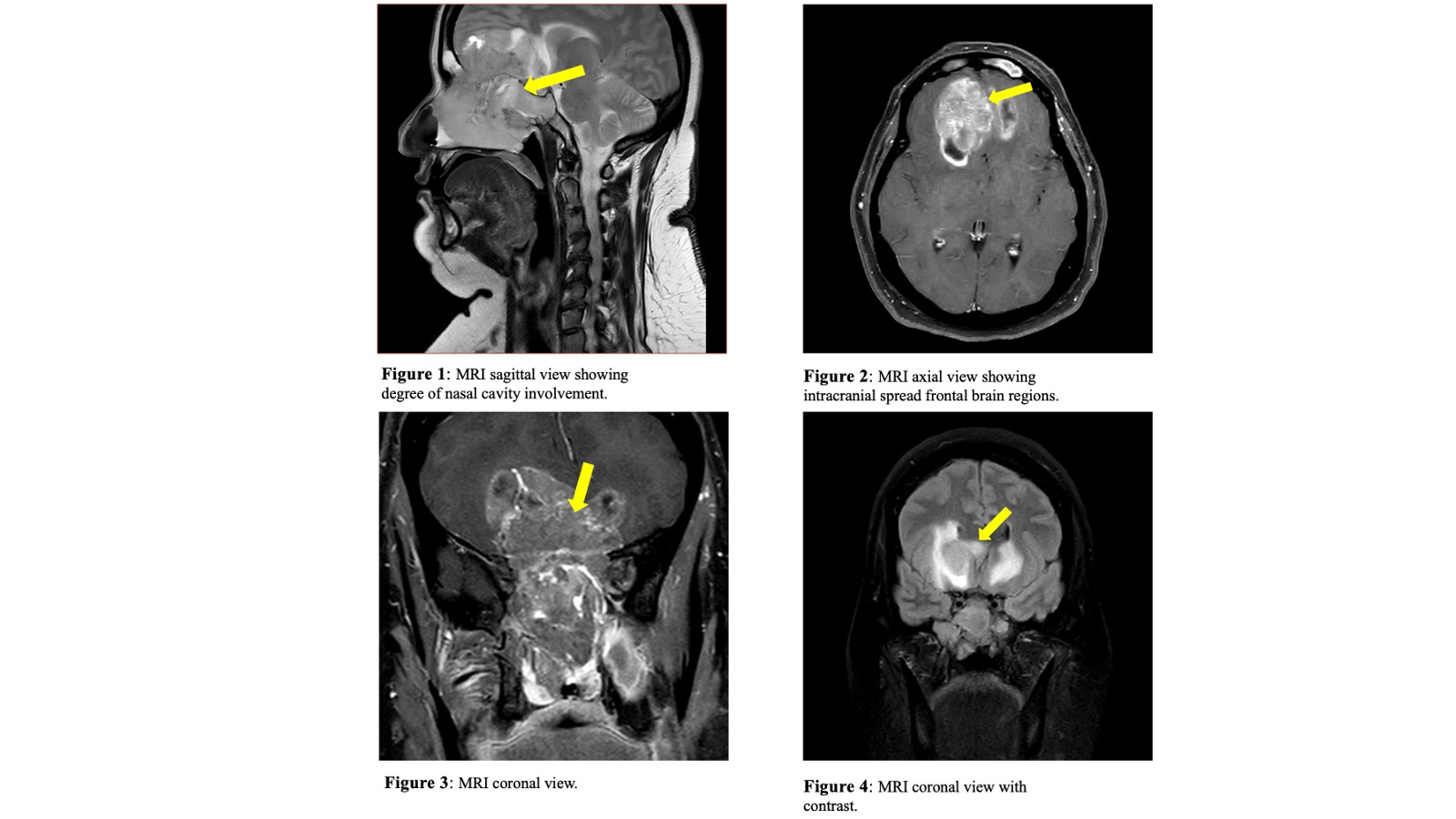 Case Presentation: A 51-year-old female with a BRCA mutation and a history of prophylactic bilateral mastectomy presented with neuropsychiatric symptoms, including confusion, memory loss, and excessive sleep. Her medical history included hysterectomy and parotid tumor resection and a family history of various cancers, including prostate, lung, and lymphoma. Initial symptoms, including headaches and nasal congestion, were treated as bacterial sinusitis. Persistent symptoms despite antibiotic treatment led to imaging, revealing an invasive mass in the nasal cavity extending into the frontal lobes. Nasal endoscopy and biopsy confirmed large cell neuroendocrine carcinoma (LCNEC) with immunohistochemical positivity for CKA1/3, CD56, synaptophysin, and CK5/6. Metastatic workup showed no distant disease. The tumor’s extensive involvement of critical structures required a collaborative surgical plan with neurosurgery and ENT skull base specialists.