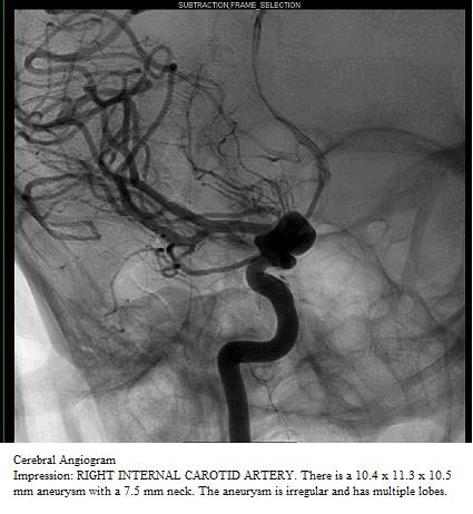 Case Presentation: A 28 year-old woman with AIDS and a CD4 count of 178 cells/mm3, not on antiretroviral therapy, presented with odynophagia for 2 weeks as well as increased swelling in her neck and inguinal area. She denied any neurological symptoms. On physical examination, the patient had extensive cervical lymphadenopathy with no other significant findings. EGD revealed esophageal candidiasis and HSV esophagitis. Fluconazole, acyclovir, dolutegravir, and emtricitabine/tenofovir were started. CT neck with contrast to evaluate the lymphadenopathy incidentally showed an enlargement of the right internal carotid artery with suspicion for aneurysm. MRA confirmed a 17 mm x 19 mm x 19 mm right supraclinoid internal carotid artery aneurysm extending to the origin of the right ophthalmic artery. The sizable intracranial aneurysm prompted immediate angiography that revealed a right ophthalmic and left anterior cerebral artery aneurysm. She was transferred to the neurosurgical service with plans to place a pipeline stent in the right ophthalmic aneurysm. The procedure was postponed due to MRSA bacteremia and the patient was lost to follow-up after discharge.