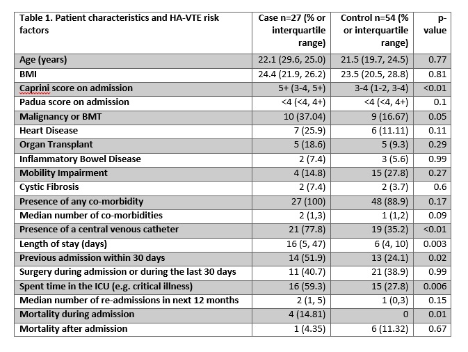 Methods: We performed a single center case-control study encompassing a 4 year period (2013-2016). Cases of HA-VTE were defined as radiographic evidence of deep vein thrombosis (DVT) or pulmonary embolism (PE) that developed ≥48 hours after admission or within 30 days of hospital discharge. Controls were matched 2:1 on age and date of admission. Six reviewers abstracted data including patient characteristics, co-morbidities, VTE risk scores (Caprini and Padua), VTE characteristics, and outcomes. Wilcoxon-rank sum test was used for continuous variables and chi-squared or fisher exact tests were used for categorical variables. Conditional logistic regression was done to estimate the association of Caprini and Padua score with HA-VTE.