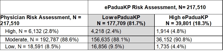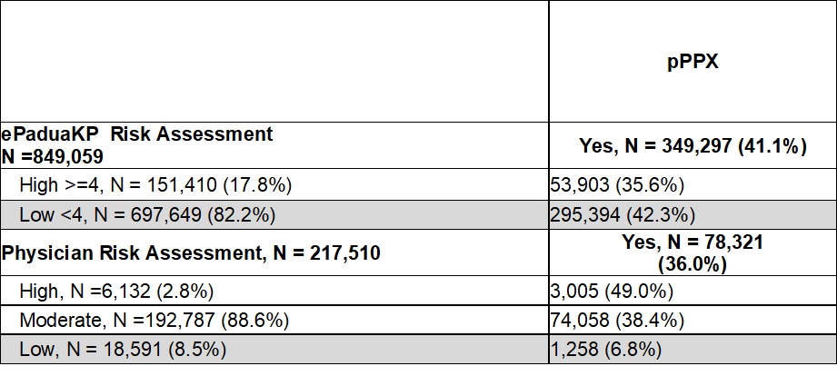 Results: Out of 849,059 encounters, 82.2% were classified as low risk by ePaduaKP, among which 42.3% received pPPX. Overall, 41.1% of these encounters received pPPX. In the subset of 217,510 encounters where clinician assessment data was available, 81.7% were deemed low risk by ePaduaKP. In contrast, 88.1% and 9.5% were assessed as moderate and low risk, respectively, by admitting clinicians. Within this smaller cohort, 36% of encounters received pPPX. Specifically, 38.4% and 6.8% of those assessed as moderate and low risk by admitting clinicians, respectively, received pPPX.