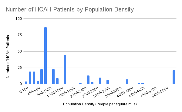 Results: The median age of admitted patients in this time period was 71.05 years old with a standard deviation of 17.37 years. 138 out of 298 total patients resided in urban areas, and 134 patients resided in rural areas according to census designations. By population density metrics alone, 157 patients resided in an area with a population density less than 1000 people per square mile. Out of 327 total HCAH enrollments, 60 (18.3%) resulted in a 30 day post-discharge ED visit. 44 enrollments resulted in a 30-day hospital readmission, either inpatient or outpatient, resulting in 13.4% 30-day hospital readmission rate. In patients living in census-designated urban areas, 31 out of 150 (20.67%) enrollments resulted in 30-day ED visits and 20 visits resulted in hospital readmissions (13.3%). In rural areas, 29 out of 177 (16.38%) visits result in ED visits, and 24 (13.56%) resulted in hospital readmissions. In a two-proportion z-test, no significant differences were found in rates between ED visits nor with readmissions for HCAH patients from urban and rural areas. During December 2021 to January 2024, all hospital ED utilization rates were 14.2%, and all hospital readmission rates were 12.4%. When comparing rates of followup ED visits in a two-proportion z-test, there was a significant increase (p = 0.03318) in hospital readmissions for HCAH compared to all hospital admissions. However, no significant difference was found between the two in ED utilization.