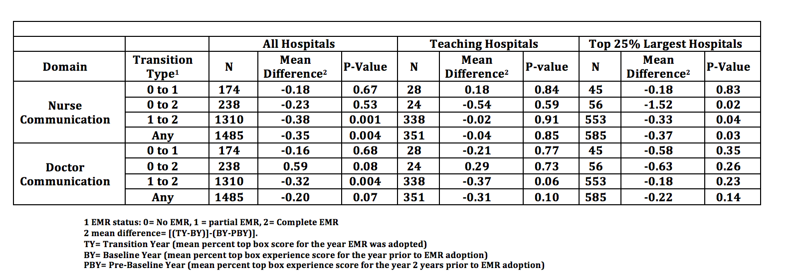 Results: There were 1485 instances reported for adoption of partial or complete EMR by hospitals. Lower nursing communication scores was associated with any type of EMR adoption (-0.35 percentage points, P=0.004) and for transition from partial to full EMR (-0.38 percentage points, P=0.001). Physician communication scores were lower for transition from partial to full EMR (-0.32, P=0.004).