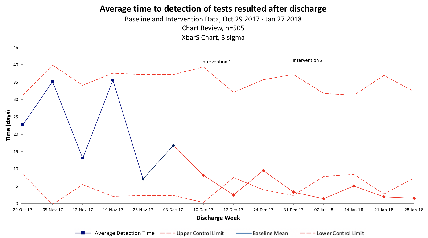 Results: From October 2017 to January 2018, 505 pending tests at discharge were identified. Pre-intervention, baseline detection time for tests that resulted after patient discharge was 19.8 days. After the first intervention, the detection time improved to 4.68 days (Figure 1). Five (50%) of the physicians completed the training, and in the survey 80% reported improved comfort utilizing the EHR, 80% reported a change in their method for detecting pending tests, and 20% reported improvement in satisfaction with their method of following pending tests. Following the second intervention, there was further improvement in detection time to 2.64 days (Figure 1). Within the second intervention period, tests sent to the administrative nurses had a shorter detection time by 1.4 days compared to those that were not. Administrative nurses reported no significant impact on their workflow. The hospitalists reported no change in satisfaction in the process of following tests using administrative nurses; nursing assistance in detecting results did not negate the necessity act upon the results even during time off.