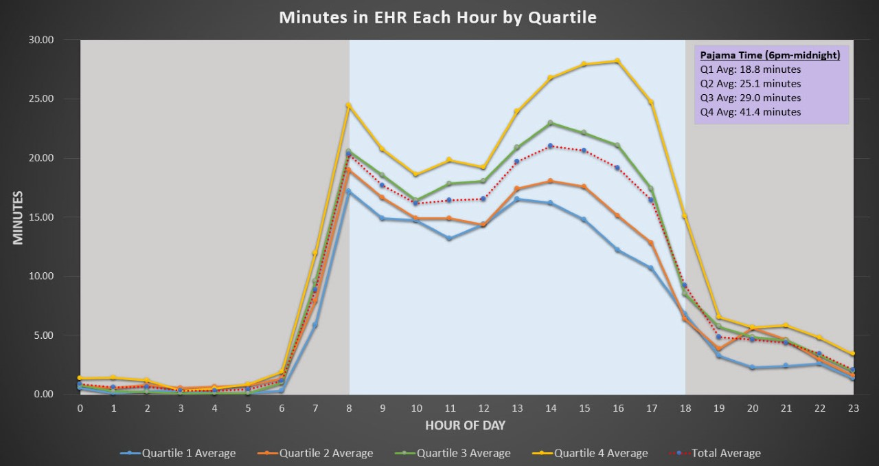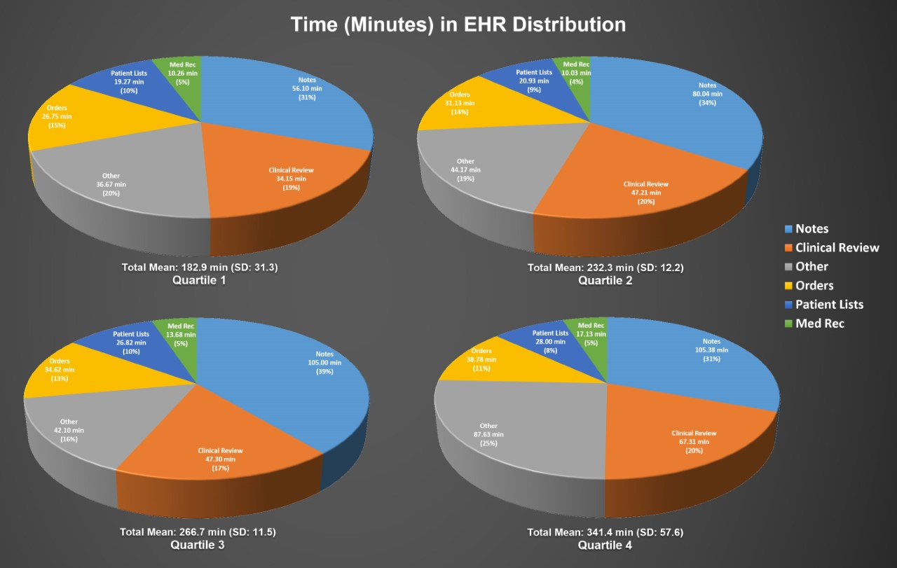 Methods: We conducted a retrospective cohort study of 44 full time equivalent, day-shift hospital medicine physicians performing direct patient care at our hospital, which uses Epic EHR. We obtained each hospitalist’s Epic activity logs for six non-consecutive months between March 2017 and March 2019. Practitioners who were responsible for admitting patients, consulting, moonlighting, or on teaching team with residents for more than 10% of their total shifts within the study periods were excluded from analysis. If a provider worked a number of different shift types within the same month, only hospitalists who conducted daytime, direct care, rounding shifts for 80% or more of a given month were included. Physicians on rounding shifts have on average 14 patient encounters each day. We ranked physicians by total time spent interacting with the EHR and divided them into quartiles. Descriptive analysis was performed using SAS statistical software.