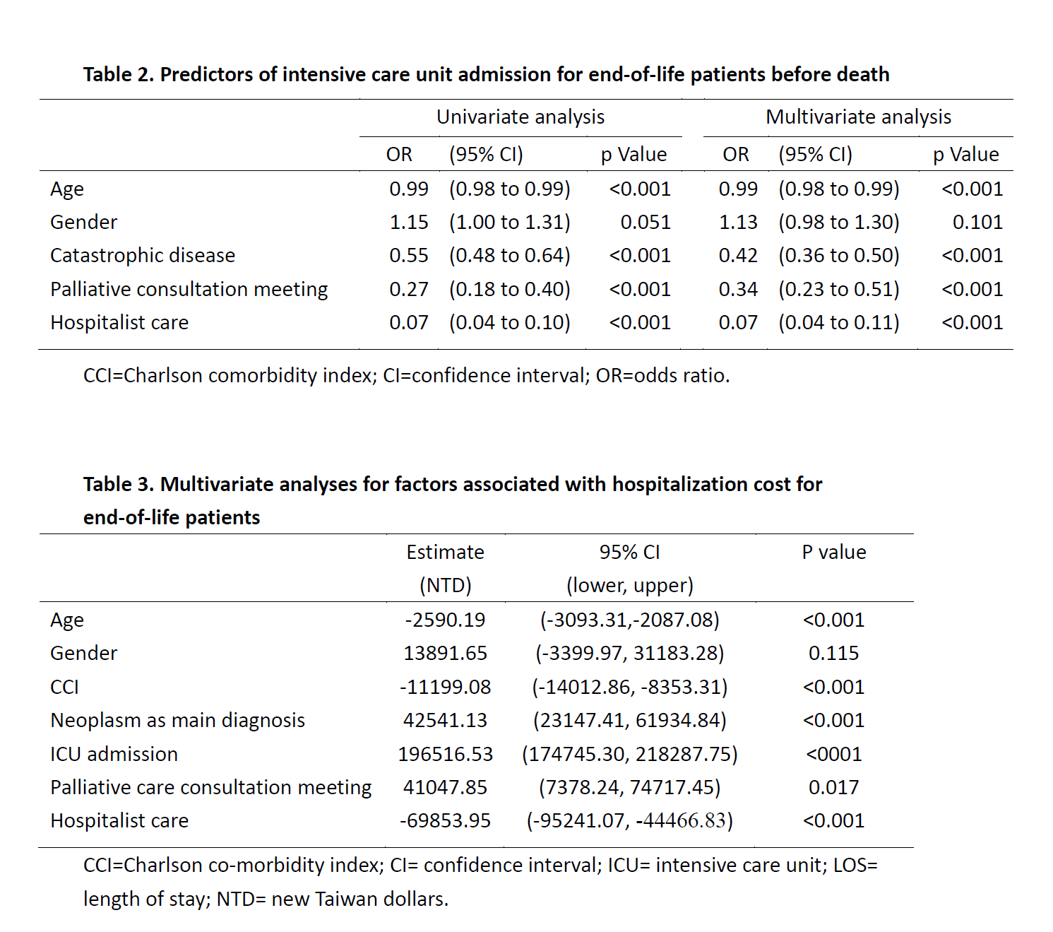 Results: From Jan 2013 Jan to Dec 2015, a total of 4434 patients were enrolled. Of all, 660 patients (14.9%) were cared by hospitalist. Compared to the comparison group, patients who received hospitalization during terminal hospitalization had fewer cancer diagnosis (28.3% vs. 45.3%, p<0.001), and lower Charlson co-morbidity index (3.16 vs. 3.65, p=0.001). However, more palliative care consultation meetings were convened by hospitalists (13.9% vs. 5.9%, p<0.001). After controlling for covariates, the multivariate regression analysis showed that hospitalist care was associated with fewer ICU admission for EOL hospitalizations (OR 0.07, CI 0.04-0.11, p<0.001). Multivariate regression showed that hospitalist care, as compared to non-hospitalist care, was associated with significant lower hospitalization costs (estimate -69853 NTD per admission), while cancer as primary diagnosis (estimate +42541 NTD per admission), ICU admission (estimate +196516 NTD per admission) and palliative consultation meeting (estimate +41047 NTD per admission) were associated with higher hospitalization costs.