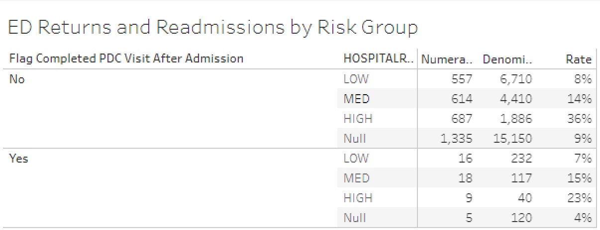 Conclusions: Our transitional innovation improves post-hospitalization primary care access and enhances patient safety and quality of care, especially in patients with higher ROR. Larger sample for patients with higher ROR may be needed for statistical significance.