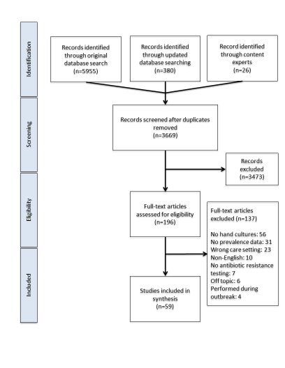 Conclusions: This review demonstrates that the prevalence of MDROs on HCP hands in the hospital vary by pathogen, care setting, and geography. Furthermore, culture acquisition method and study design also appear to influence detection rates. HCP hand hygiene can be improved by utilizing this data to enhance knowledge, practice, and research surrounding hospital acquired infection prevention.