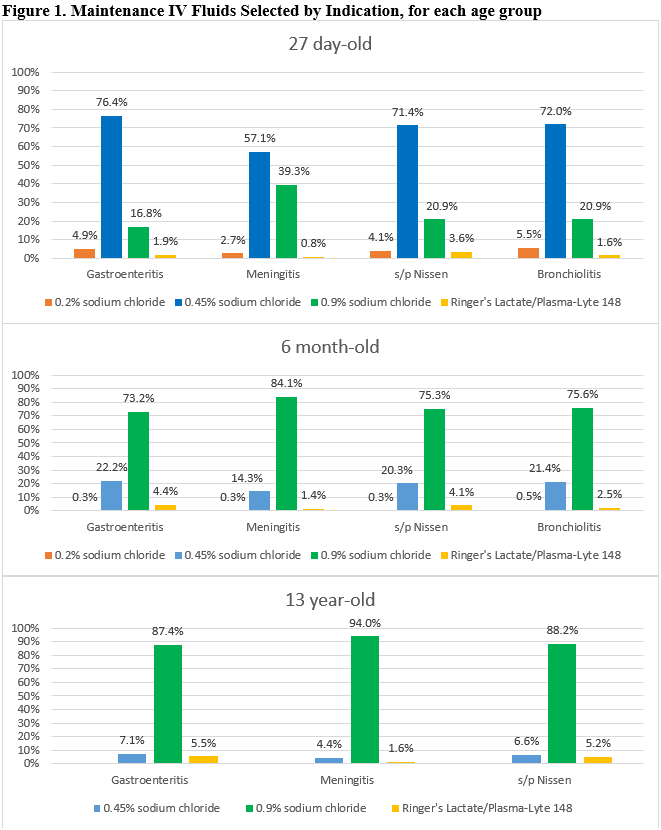 Results: There were 402 total responses (10.1% response rate). Isotonic solutions were preferred by respondents in older children compared to younger age groups, at 87.8% for the 1-18 years age group compared to 66.3% for the 28 days to 1-year age group and 10.6% for the younger than 28 days age group (all p values < 0.0001). When presented with disease states associated with ADH excess, isotonic fluids were preferred in higher percentages in the 6 month-old and 13 year-old age groups, but not in the 27-day-old group when 0.45% sodium chloride was preferred (see Figure 1 for specific disease state data); 0.2% sodium chloride was rarely chosen.