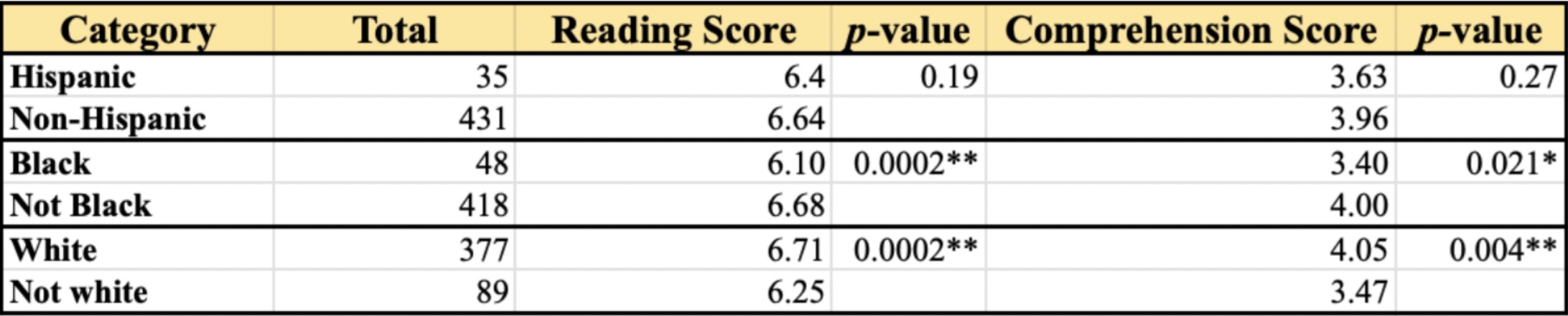 Results: There were 466 patients screened by 85 volunteers for HL through REALM-SF with a mean reading score of 6.6 and mean comprehension score of 3.9. Binary logistic regression found that those with perfect reading scores were 574% more likely (p=< 0.001; 95% CI 4.0-12.3) to score higher on their comprehension score. Hispanic patients were 71% (p-0.019 CI: 0.10-0.82) less likely to do well compared to non-Hispanics. Black patients had lower reading (6.1 vs. 6.7, p=0.002) and comprehension scores (3.4 vs. 4.0, p=0.021) compared to non-black patients. Female patients had higher comprehension scores compared to men (4.2 vs. 3.7, p=0.003). In terms of age, patients in the highest age cohort (83-97 years of age) had a lower mean comprehension score compared to the mean of other age groups (3.41 vs. 4.04 p=0.003).