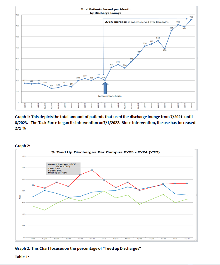 Methods: The task force consisted of key stakeholders from the Hospital Medicine, Case Management and Process Improvement departments. Goals were set to reduce Length of Stay by 0.25 days for the department, enhance throughput by decreasing ER hold hours and increasing the number of transfers accepted by our system, and improve quality outcomes in readmission, complication, and mortality rates. The following process changes were made:1. Monthly tips were sent to providers focused on best practice tips to providers focusing on weekend barriers, early initiation of home health and SNF orders, communication with case management, early documentation of disposition, and early use of mobility protocols. 2. Increase the number of direct admits by revamping the triage process, addressing barriers to direct admission, and engaging PCPs to bypass the ER when referring their patients.3. Elevating the use of our discharge lounge (an area at where patients stay after they are discharged if they are waiting on a family member, etc.) by reformatting criteria and monitoring utilization. (see Graph 1) 4. We set a goal of identifying barriers to discharge early by establishing a 3pm bed huddle between our discharge navigators and case management. We developed and monitored “teed up discharges” as a discharge milestone. (see Graph 2) This milestone promoted identification of potential discharges 24 to 48 hours before discharge allowing early identification of barriers.