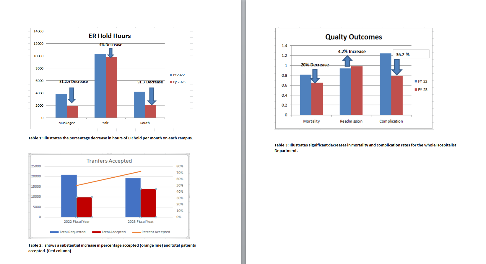 Results: The changes showed significant improvements in all of our throughput measures. This included a decrease in ER hold hours of 4%, 51.2%, and 51.3% at our three acute care campuses. (Table 1.) This occurred in conjunction with each ER having an increase in the total number of visits from Fiscal Year 2022 to 2023. In addition, the percentage and total number of patients accepted increased. (Table 2) Length of Stay in our department decreased 8.4% or 0.51 days throughout our department. (Graph 3) Finally, we had decreases in both our mortality and complication rate by 20 and 36% respectively, with a slight increase in readmission rate (Table 3)