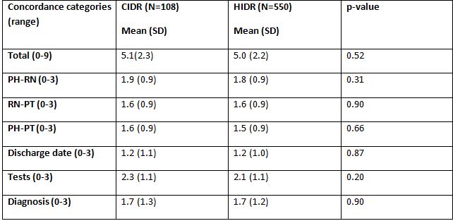 Results: 658 patients were included in the final analysis. Patient characteristics were distributed evenly across IDR groups. 166, 272 and 220 patients were in the ranges of total concordance 0-3, 4-6 and 7-9, respectively. In unadjusted analyses, total and subgroup concordance scores were not different between CIDR and HIDR groups (Table 1).