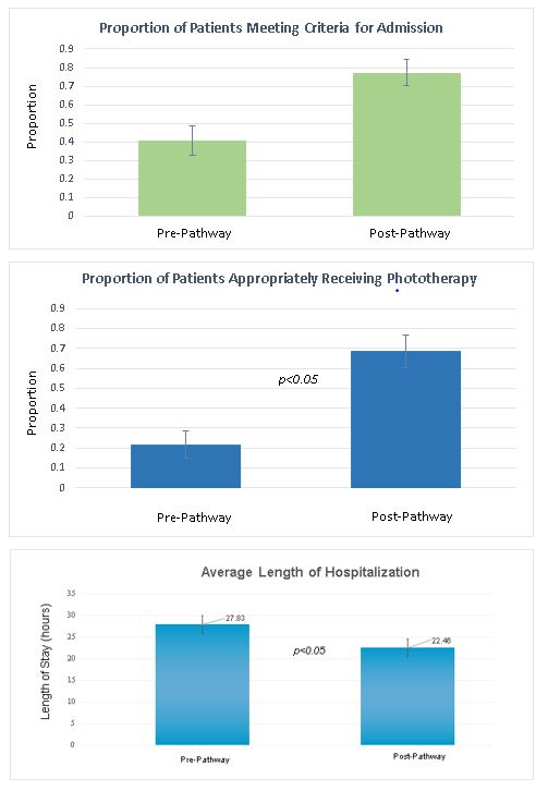 Conclusions: Based on these results, we conclude that the newly implemented hyperbilirubinemia pathway has effectively reduced unnecessary hospital admissions for hyperbilirubinemia, improved rates of appropriate initiation of phototherapy, and reduced length of stay. This indicates an improvement in risk stratification of patients and improvement in management of patients once admitted which has direct effects on patient safety. Furthermore, reductions in inappropriate treatment initiations suggest that that the pathway also may decrease unnecessary admissions, decreasing the exposure to possible hospital acquired infections and parental stress in the vulnerable neonatal population.