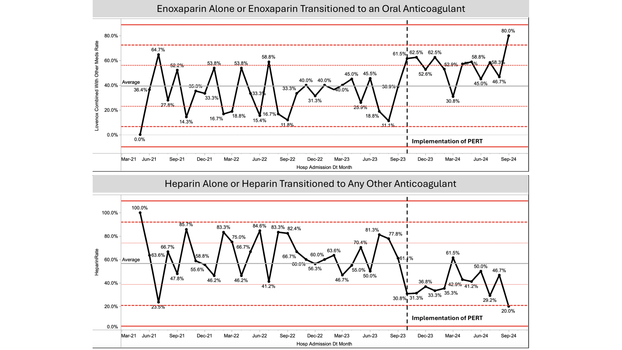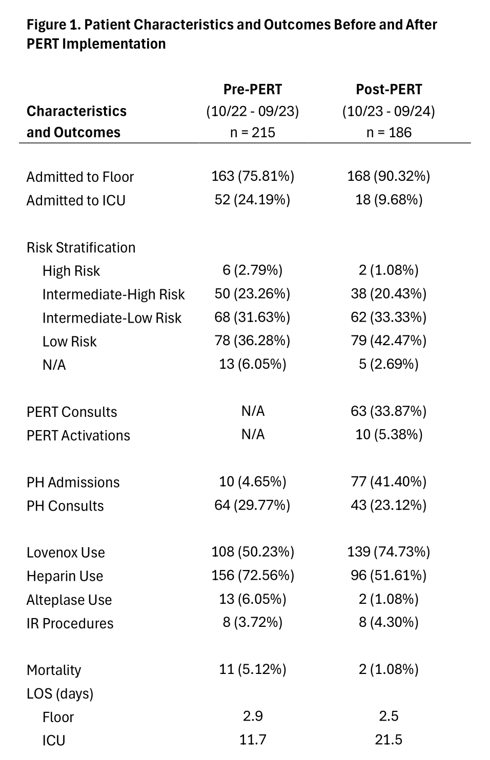 Methods: The PERT was established in October of 2023 as a collaborative effort amongst faculty from pulmonary hypertension (PH), critical care, interventional radiology, and cardiovascular thoracic surgery. Physicians throughout the hospital were trained to risk stratify PE patients at the time of diagnosis and all intermediate-high risk and high-risk patients were to be discussed with the PERT leader to determine whether PERT activation was appropriate. A PERT activation provided immediate access to a team of experts to guide care. Additionally, emergency room physicians were asked to admit all patients with a primary diagnosis of PE to the PH service, unless the patient’s comorbidities necessitated admission to a different service. Physicians throughout the hospital were also educated on evidence-based practices for PE patients, including anticoagulant choice. The charts of all patients with a primary diagnosis of acute PE during the pre-PERT (10/22-9/23) and post-PERT (10/23-9/24) periods were reviewed to determine risk stratification, PH admission and consultation rates, PERT consultation rate, anticoagulation use, length of stay (LOS), and mortality rate.