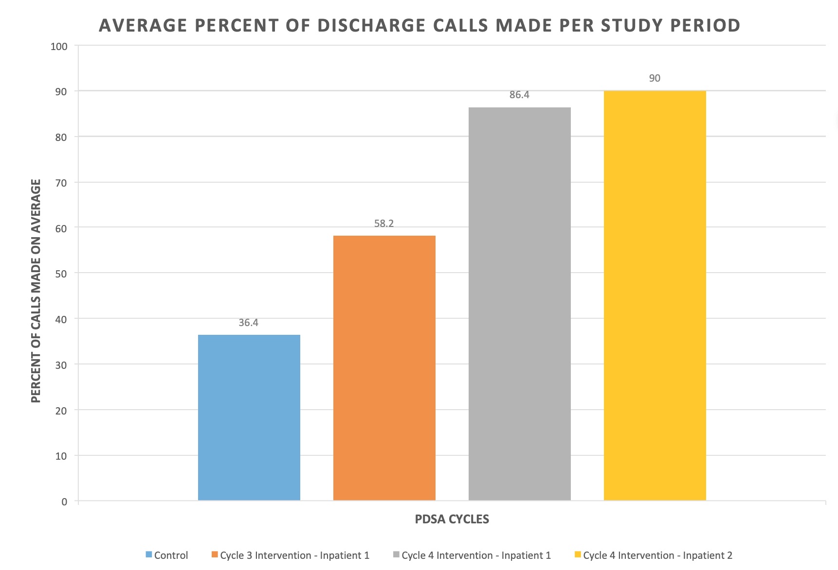 Description: An initial residency-wide survey was administered to identify barriers to providing timely pediatrician updates. Based on the results, a series of staged interventions were implemented through four Plan-Do-Study-Act (PDSA) cycles over a one year time period. PDSA Cycle 1 focused on clarifying communication expectations through the distribution of a “PMD Communication Guidelines” document to inpatient resident teams, as well as a script of a sample update call for reference. For Cycle 2, the senior resident was encouraged to discuss PMD updates at the conclusion of each patient presentation during morning rounds and assign a specific team member to make the call, if necessary. Modest subjective improvement was observed with these interventions over a 2-week period; however, logistical challenges with data collection limited interpretation. Cycle 3 repeated interventions from Cycle 2 over a 2-week period, while also incorporating “PMD Communication” into the nursing rounding checklist, with the hope of engaging interdisciplinary team members. Improvement from a baseline average of 20.4% of admission and 36.4% of discharge calls to 23.5% of admission and 58.2% of discharge calls was identified (Figures 1 and 2). Cycle 4 expanded on the interventions from Cycles 2 and 3 by including two general medicine inpatient floors, again over a 2-week period. The “PMD Communication Guidelines” document was updated and re-distributed, and documentation of PMD updates was encouraged by creating a section within the resident handoff to reflect the last date a PMD call was made and the next planned update. With these interventions, the average percent of admission calls improved to 88.7% and 89.25% on the two general medicine inpatient floors trialed, and discharge call rates improved to 86.4% and 90% (Figures 1 and 2).