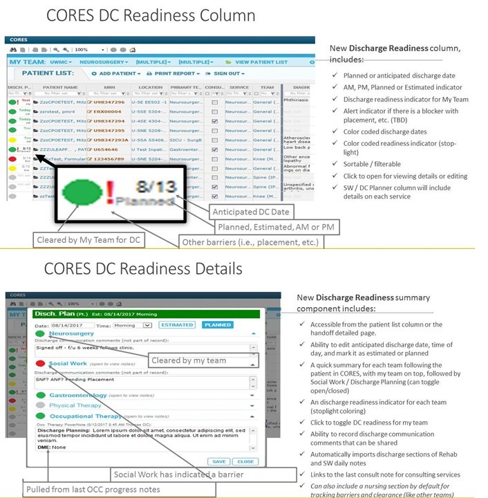Purpose: To test our hypothesis, we developed and deployed an EMR discharge tool that: non-intrusively collects discharge data; readily displays discharge progress, tasks, and barriers; communicate data throughout the inpatient environment with optimization of delivery method and timing for different roles; allows undocumented comments that facilitate discharge; and provides these data on desktop and mobile. The purpose of the intervention is to: enable all care teams to work towards the same discharge date goal and plan; increase visibility and awareness of the anticipated or planned discharge date across all care team members, such that every team is aware of patients that are anticipated or planned for discharge either today or tomorrow during pre-rounding prep and rounds to avoid “misses”; increase visibility to possible discharge barriers (such as SNF placement issues with SW, or clearance issues with consulting services); make it easier to access discharge notes that are “buried” in daily progress or consultation notes; and ensure that the same discharge information is available throughout a patient’s chart, to eliminate “source of truth” issues.