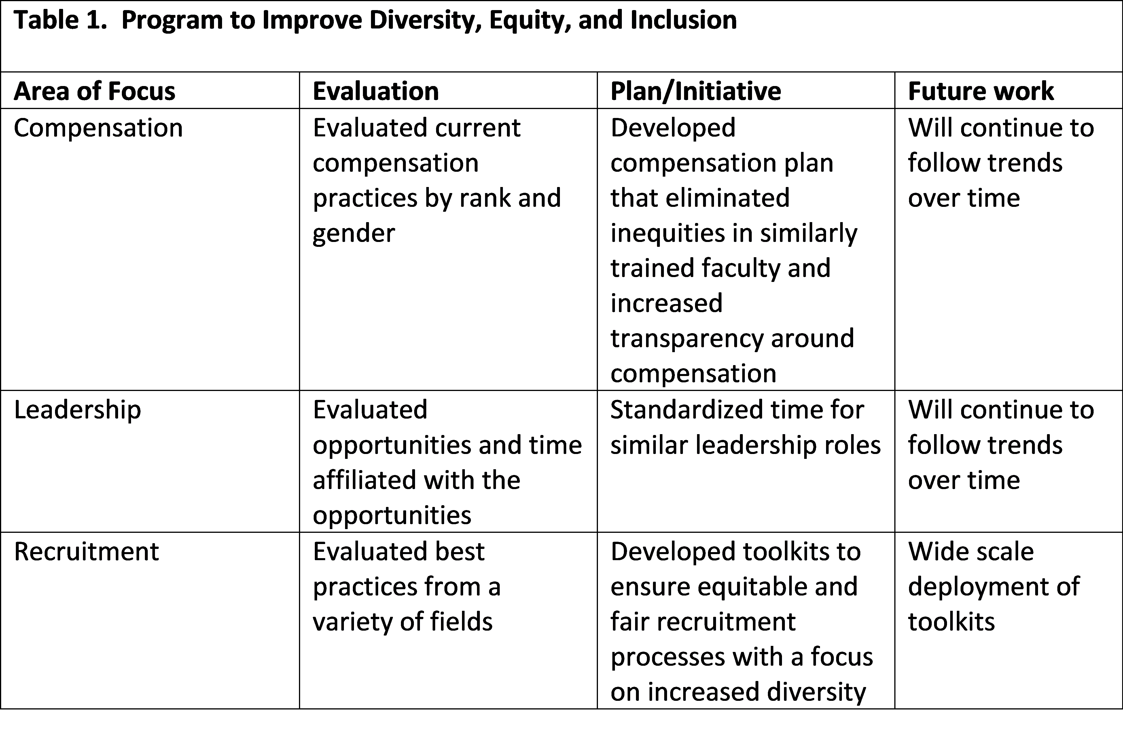 Description: The DHM held a focus group early in the year, led by our Division Head and Director of Diversity and Equity, to discuss perceived issues around diversity, equity, and inclusion with a specific focus on compensation. While our group defined compensation broadly, salary, protected time, and leadership opportunities remained at the forefront. Based on key areas that were identified, we performed an in-depth review of: (1) Compensation practices within the Department of Medicine and DHM by rank and gender, (2) Leadership roles, including associated funding and protected time, and (3) Diversity recruitment strategies. Utilizing data from our internal review of current practices, as well as a review of best practices from an array of fields, we created best practices around compensation and recruitment for our division. A variety of initiatives were developed (Table 1), which included (1) Development of a compensation plan that eliminated salary inequities among faculty of similar rank/training, (2) Standardization of the Full Time Equivalent (FTE) for similar leadership roles, and (3) Development of toolkits for achieving gender equity and diversity in recruitment, focused on committee composition and candidate pools. Each of the initiatives were vetted with Departmental and hospital leadership as their support in these initiatives were key to the successes. Our toolkits are being utilized at both the division and departmental level and were recently published by the Association of American Medical Colleges (AAMC).