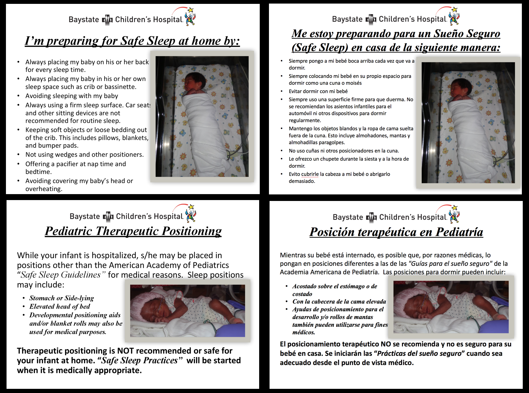 Description: This is a QI study, with baseline data being collected over a period of 2 weeks by the night team residents on the floor. On night rounds, between 10PM – 12AM, they will observe the sleeping positions of all patients ages 0 – 12 months of age and will document their observations. Documentation will include a checklist describing the observed sleeping position and situation. Data will be entered into Tufts CTSI REDCap, a secure electronic database. The first PDSA cycle will focus on caregiver education, in the form of a card placed at the bedside with a picture of an infant in SSP and an explanation of SSP. Cards will be available in both Spanish and English and will be cards that have been adapted from the ones currently used in the Baystate Children’s Hospital NICU. If the infant is has not been placed in safe sleep purposefully for therapeutic reasons, there will also be a card indicating that the infant is in “therapeutic sleep positioning,” along with the card showing SSP. The second PDSA cycle will also be focused on patient/parent education. On admission to the inpatient floor, parents will be given the AAP handout on safe sleep by their nurse or by the admitting resident. Parents will be informed that we promote safe sleep positioning in our hospital and will be asked to read the handout. The third PDSA cycle will focus on patient education through the use of Family Centered Rounds (FCR). The day inpatient resident teams and attendings will receive a script to follow to discuss safe sleep on FCR and the first time they round on a newly admitted infant.
