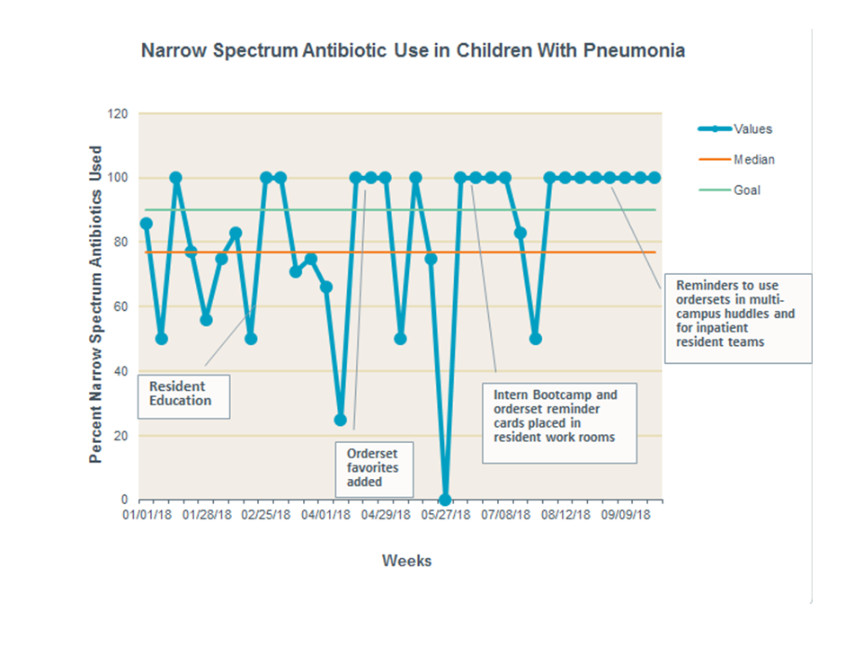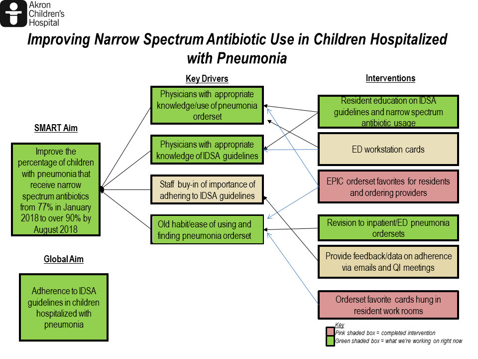Background: In 2011, the Infectious Diseases Society of America (IDSA) published new guidelines on the management of community acquired pneumonia (CAP) in children and recommended use of narrow spectrum antibiotics such as ampicillin or amoxicillin over broader spectrum antibiotics such as ceftriaxone. Many studies have shown that these guidelines have been adopted with varying success across the U.S. At Akron Children’s Hospital, children receive narrow spectrum antibiotics for CAP approximately 77% of the time. This quality improvement project aims to increase the percentage of children receiving narrow spectrum antibiotics from 77% in January 2018 to over 90% by August 2018.