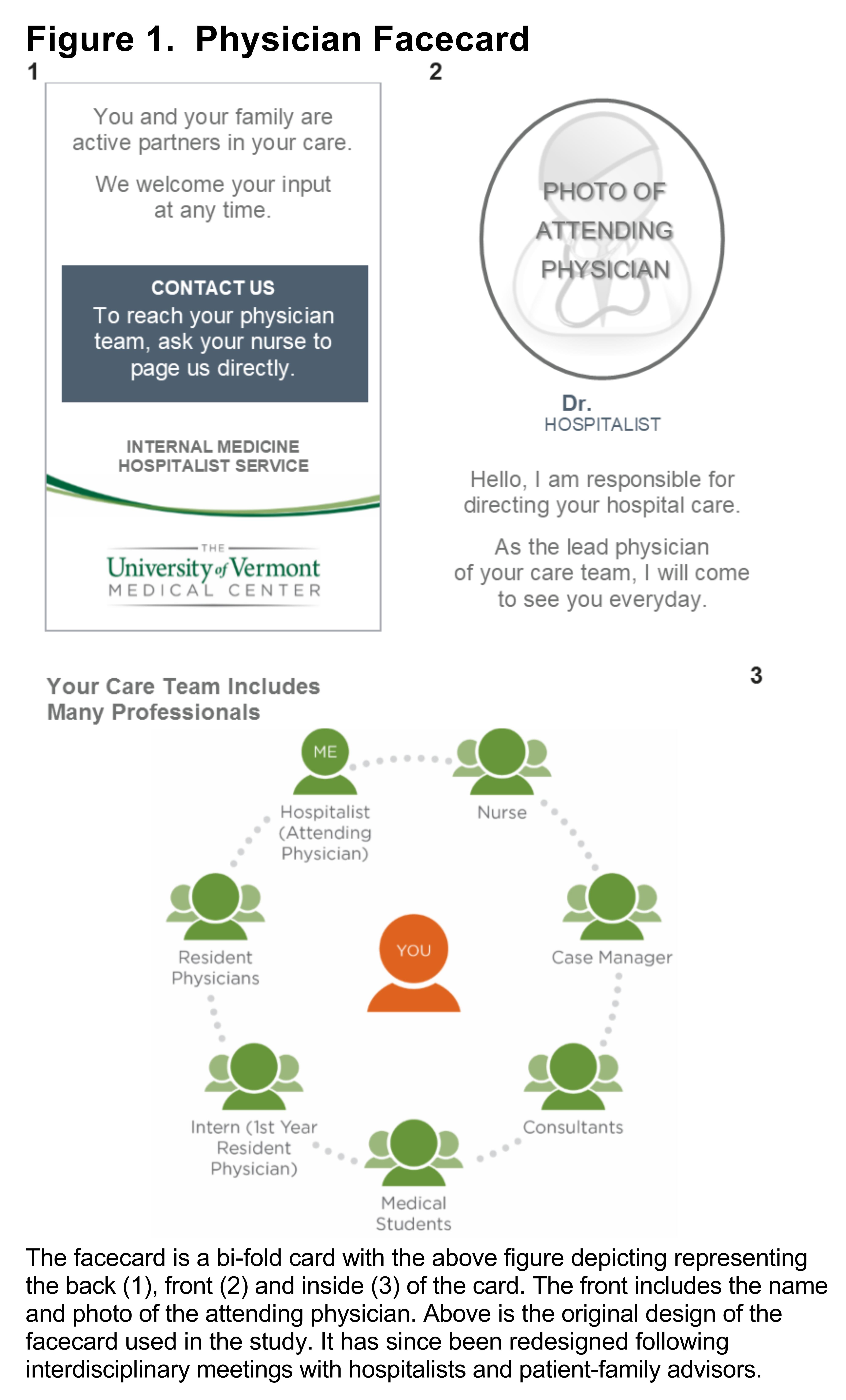 Methods: This prospective study was conducted at the University of Vermont Medical Center. A total of 149 patients and 18 hospitalists were enrolled. Patients were eligible for enrollment if they were admitted to the internal medicine hospitalist teaching service, and hospitalists were enrolled if they were the attending physician on the inpatient service. Hospitalists were randomized to use a physician facecard (intervention, Figure 1) or not (control) during all patient encounters. Patients were surveyed to assess their ability to identify their attending physician and other members of their physician team. Observational data was also collected regarding use of patient whiteboards. Additionally, hospitalists were surveyed to assess their perception of patient’s ability to identify their physicians, as well as attitudes towards use of the facecard.