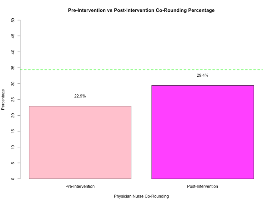 Conclusions: Although we did not reach our goal of a 50% increase from baseline in bedside co-rounding for patients with behavioral concerns, we were able to achieve a significant improvement in physician nurse communication measured by bedside co-rounding rate. Pre-intervention data collected one year prior to our intervention demonstrated 22.9% co-rounding, while the data collected after incorporating our intervention displayed 29.4% co-rounding which is a 28% increase in co-rounding, demonstrating that our intervention reached the intended audience and trended towards reaching our goal. Some limitations included the limited study period and limited resources of this medical student quality improvement project. Future directions would involve expanding the intervention to encompass more patient populations by adoption of this practice as a prioritized quality improvement initiative driven by clinical service leadership.