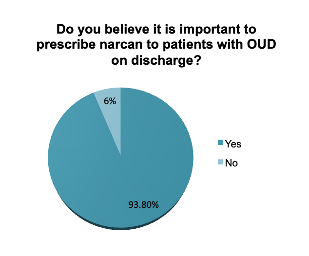 Conclusions: Our student-led quality improvement (QI) project increases patient safety by increasing provider decisional support, efficiency of practice, and ease of prescribing Naloxone, helping providers comply with the new co-prescribing law. We hope to decrease the discrepancy between provider beliefs about the importance of naloxone and their prescribing rates. By adding naloxone to the power plans, this project connects inpatient management to outpatient pharmacy through the use of the electronic medical record (EMR), which has not been done at this institution, resulting in an interdisciplinary effort to manage Opioid Use Disorder (OUD) and remove barriers like transportation. We are hopeful that future data analysis will show an increase in the rate of naloxone prescription. Our research highlights the importance of ensuring providers are aware of existing power plans and that power plans meet the standard of care so they can be properly utilized. Our findings also demonstrate the power of QI initiatives to identify areas of improvement and effect change.