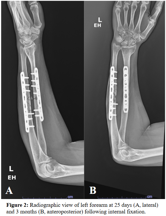 Case Presentation: A 39-year-old female with no past medical history presented 3 weeks after an ATV accident in Lebanon. She had sustained a closed left proximal humerus fracture and an open left midshaft radius/ulna fracture exposed to vegetation. She was treated in Lebanon with urgent open reduction and internal fixation, and irrigation and debridement. Ten days later, she removed her sutures and noted purulent drainage and was treated with 3 weeks of amoxicillin/clavulanate. Upon returning to the US, she was prescribed 1 week of trimethoprim/sulfamethoxazole (TMP-SMX).At initial US follow-up, the forearm had a 1 cm x 1 cm granulating wound without visible infection and mild pain along the ulnar plate with limited hand movement. Radiography confirmed stable fixation. Doxycycline was prescribed for possible deep tissue infection but declined due to GI intolerance.Five days later, she reported persistent bloody drainage. She was evaluated in the ER and scheduled for irrigation and debridement but left against medical advice despite concern for sepsis. Two days later, she returned and underwent irrigation, debridement, and sinus tract excision. Piperacillin-tazobactam and vancomycin were initiated pending cultures.Cultures grew gram-negative rod Buttiauxella izardii/agrestis, determined to be highly susceptible. She completed a 6-week course of ciprofloxacin, followed by 6 months of minocycline suppression due to retained hardware. Infection resolved; however, follow-up shows possible ulnar non-union with persistent pain requiring monitoring.