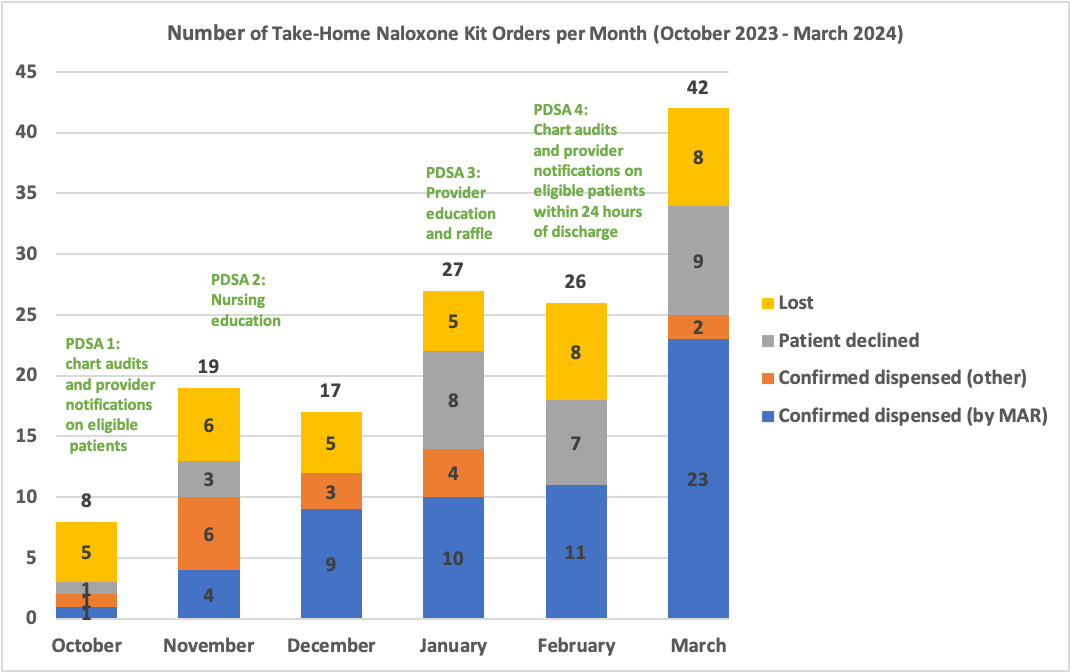 Conclusions: By March 2024, the number of naloxone kit orders placed reached 59% of the expected monthly target, exceeding our goal of 20%. While this outcome is encouraging, our primary challenge moving forward will be sustainability. The most effective strategy so far has been manual chart audits and secure chat reminders for eligible patients within 24 hours of discharge. However, this intervention is labor-intensive and not sustainable in the long term. Next steps include collaborating with a multidisciplinary team across our health system to implement a best practice advisory alert within the EMR, which we believe is essential to the continued success of this initiative.