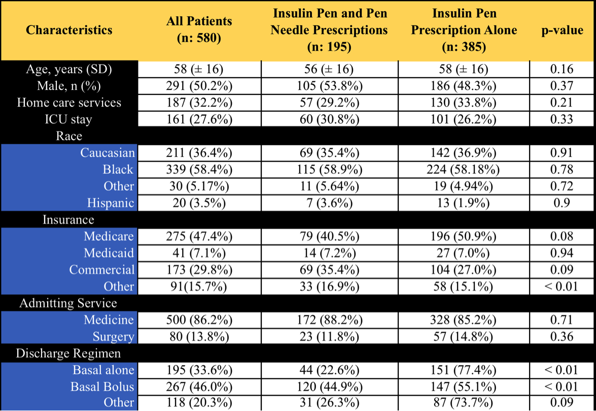 Results: Among 580 patients discharged on insulin pens, mean age was 58 years (± 16), 50.2% were male, and 58.5% were African-American. Most patients had Medicare insurance (47.4%), were admitted to medicine services (86.2%), and were discharged on a basal-bolus insulin regimen (46%), followed by basal insulin alone (33.6%). Notably, only 195 patients (33.6%) had an associated prescription for pen needles at discharge. Patients on basal insulin alone and on a basal-bolus regimen were significantly more likely to be discharged without an associated prescription for pen needles, 77.4% vs 22.6% (p<0.01) and 55.1% vs 44.9% (p<0.01), respectively.