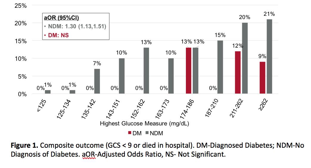 Results: Increased glucose measures were associated with increased poor outcomes in NDM patients, but not in patients with diabetes (Figure 1). Among NDM patients, only 46% of patients with severe hyperglycemia were administered insulin, compared to 90% of patients with diagnosed diabetes. In a multivariate model, NDM patients with moderate hyperglycemia were almost six-fold more likely, and those with severe hyperglycemia were seven-fold more likely to discharge with low GCS or die in hospital (Table 1).
