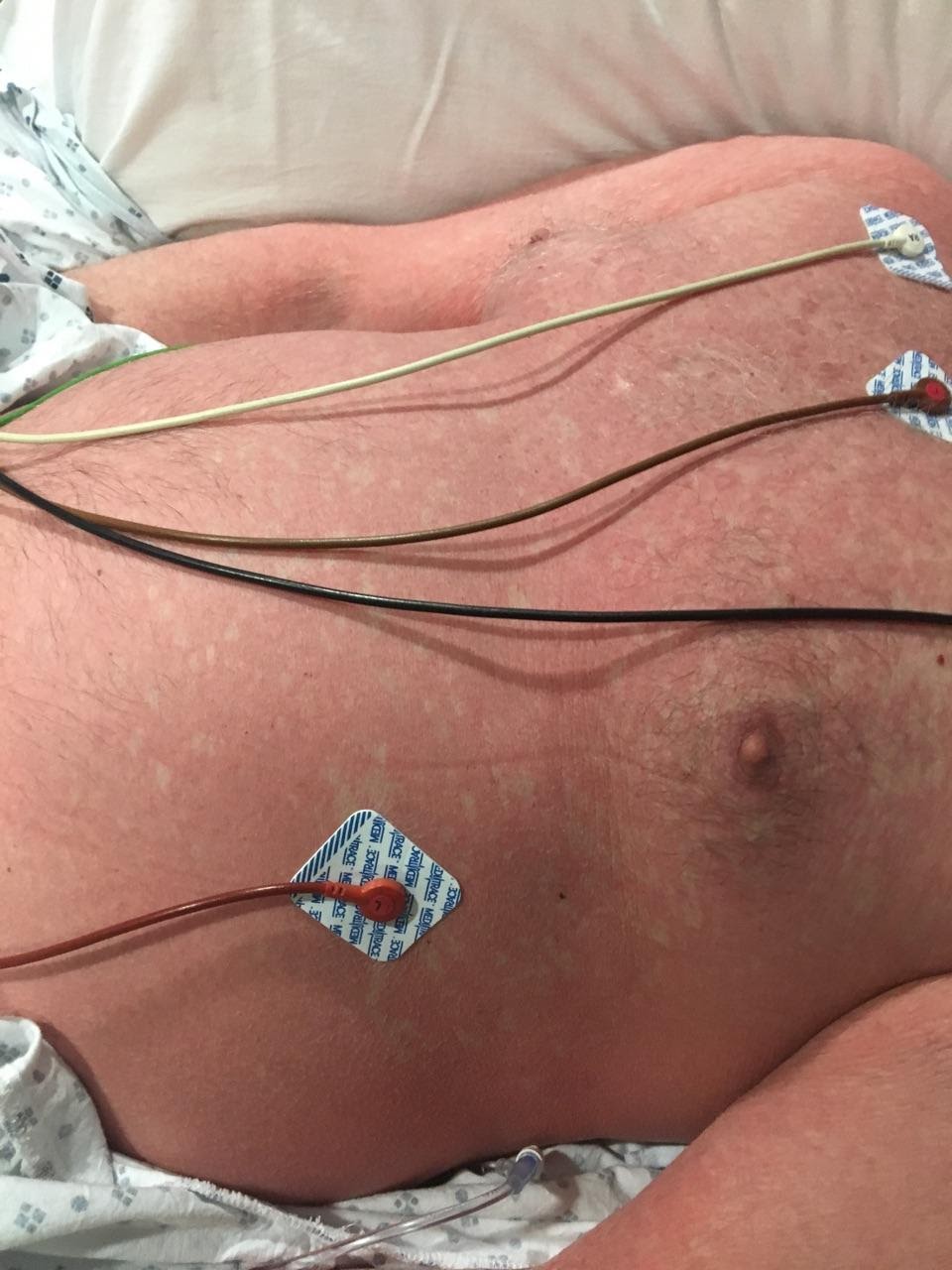 The patient reported a history of penicillin allergy with severe rash with mucosal involvement ten years previously. Penicillin G desensitization was performed with escalating doses over four hours without incident. Treatment dosing of two million units every four hours was initiated immediately thereafter. During infusion of the second treatment dose the patient developed a diffuse confluent erythematous rash on his torso, back, arms, and legs. Heart rate increased from 68 to 100 and temperature increased from 36.2 C to 37.8C. The patient noted worsening malaise and headache. A diagnosis of Jarisch-Herxheimer reaction was made, and intravenous penicillin G was continued. Within 12 hours the patient’s generalized rash resolved and his vital signs returned to normal. He was discharged to home to complete two weeks intravenous penicillin G via PICC line.