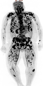 Case Presentation: A 40-year-old male presented to the emergency department with complaints of back pain for 3 weeks. He described the pain as aching and circumferential involving the sternum, right ribs, shoulders, and back. His previous medical history was unremarkable and he never had any prior imaging studies. Plain radiographs of the spine did not show any osseous abnormalities. Because of the patient’s highly elevated alkaline phosphatase (1,051 IU/L), a computed tomography (CT) scan of the chest, abdomen, and pelvis was performed (figure 1). This revealed an enhancing right upper pole renal mass suspicious for renal cell carcinoma with nodal, left adrenal and extensive bony metastasis. In the chest, there were extensive lytic and sclerotic bone metastases. Interventional Radiology performed a CT guided core biopsy of one of the metastatic lesions in the left iliac crest; cytology reported metastatic malignant cells with immunohistochemical findings positive for Ae1/Ae3 and PAX8. This was highly suggestive of metastatic renal cell carcinoma, however, the specific histological subtype (clear cell vs non-clear cell) was not identified due to an insufficient tissue sample from the earlier core biopsy. A subsequent positron emission tomography (PET) scan revealed extensive metastases with multiple soft tissue implants, retroperitoneal lymph nodes and extensive osseous involvement (figure 2). The patient was scheduled for a repeat core biopsy (retroperitoneal) for a more specific histological diagnosis (clear cell vs non-clear cell) on the demand of the treating oncologist and commenced on treatment with Sunitinib in the interim.