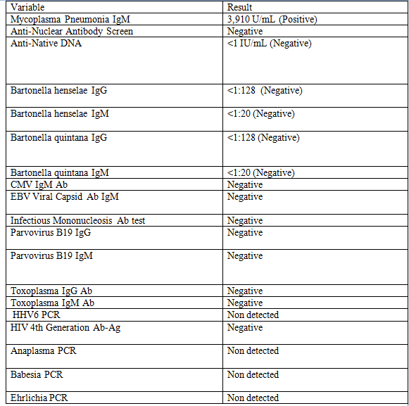 Case Presentation: A 9-year-old boy with sickle cell disease (SCD) presented with 5 days of fever and left-sided neck pain. His physical exam was notable for tender cervical lymphadenopathy bilaterally as well as objective fever. Laboratory studies revealed leukopenia, a microcytic anemia, and elevated c-reactive protein. A nasopharyngeal viral PCR panel was negative. An ultrasound of the neck was obtained, which showed bilateral cervical lymphadenitis. Following blood cultures and the administration of IV antibiotics, he was admitted to the floor. Despite broad spectrum antibiotic therapy, the patient’s condition did not improve over the next week. A more extensive workup (Figure 1) was undertaken with the only notable result being a positive Mycoplasma pneumoniae IgM, for which azithromycin was started. He continued to remain febrile with left sided cervical lympadenopathy, and elevated inflammatory markers. With input from infectious disease, hematology/oncology and surgery, as well as the patient’s mother, the decision was made to perform an excisional biopsy of his largest cervical lymph node. Pathology revealed morphologic features suggestive of histiocytic necrotizing lymphadenitis, a pattern most typical of Kikuchi-Fujimoto disease (KFD). Prednisone was started resulting in symptomatic improvement and the patient was discharged home after an otherwise uncomplicated hospital course.