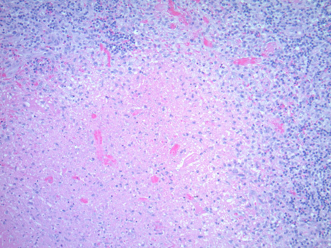 Discussion: KFD is a characterized clinically by painful cervical lymphadenopathy, occasionally associated with fever, malaise and upper respiratory symptoms. Laboratory evaluation is often nonspecific with a variety of findings being described including anemia, leukopenia and elevated inflammatory markers. While the pathogenesis is unknown a hyperimmune response in genetically susceptible patients has been proposed. There are reported cases of KFD in SCD patients with a number of them being complicated by the development of autoimmune disorders. The diagnosis of KFD is based on lymph node histology (Figure 2) and can be difficult given the nonspecific signs and symptoms. Some patients have gone on to develop systemic lupus, however the majority have a benign clinical course. In this case, the patient showed no improvement despite antibiotic treatment. His lymphadenopathy, ongoing fevers, and laboratory abnormalities, as well as his underlying SCD, led the team to consider alternative diagnoses and move ahead with the appropriate diagnostic test.