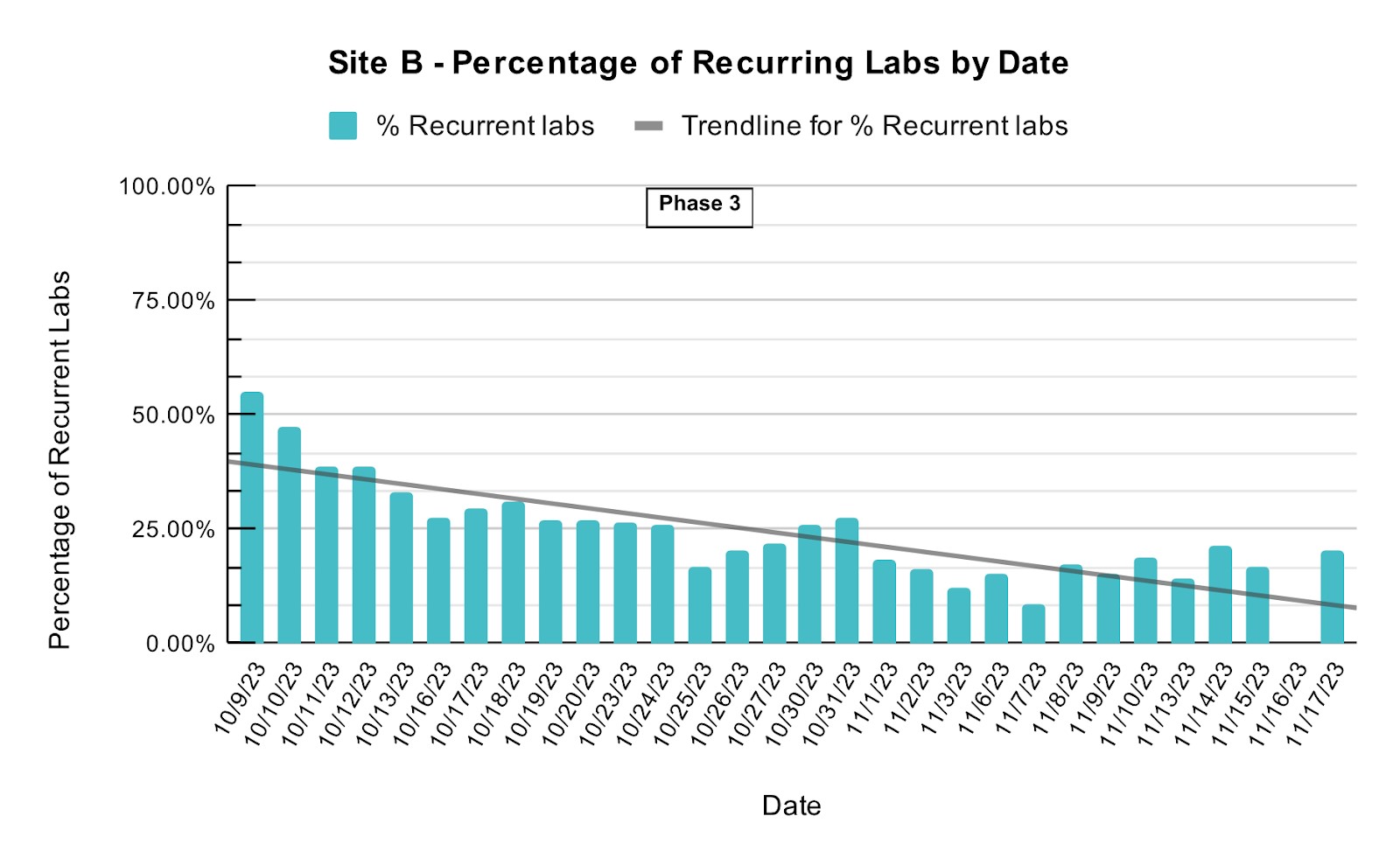 Methods: Our primary endpoint was to reduce the number of common labs ordered on the inpatient medicine services per patient by 10% over six months. Our process measure was the percent of inpatients with recurrent lab orders (labs ordered for multiple days). We created a “recurrent labs” flag in the electronic health record (EHR), audited patient charts five times a week, and provided feedback to the teams. We also queried the EHR for the total numbers of the most common venous blood studies. These included CBC, BMP, CMP, LFTs, PT/INR, APTT, Magnesium, Phosphorus, and T+S. The study was divided into three phases: Phase 1 (Jan. 3-20, 2023) established baseline data. Due to the low percentage of recurrent labs being ordered on the non-teaching service, we focused on the teaching service, where rates were much higher. Phase 2 (Jan. 20 – Oct. 4, 2023) combined chart audits, team feedback, and educational sessions for residents, advanced practice practitioners, and hospitalists to emphasize the principles of effective lab stewardship. We distributed mouse pads, chocolates, and handouts with a QR code linked to an intranet site outlining the initiative. During phase 2 we also surveyed the house staff anonymously to assess barriers in reducing recurring lab orders. Phase 3 (starting from Oct. 9, 2023) broadened the aforementioned interventions to a second site (Site B) and introduced incentives for the team with the fewest recurring lab orders over each two-week period.