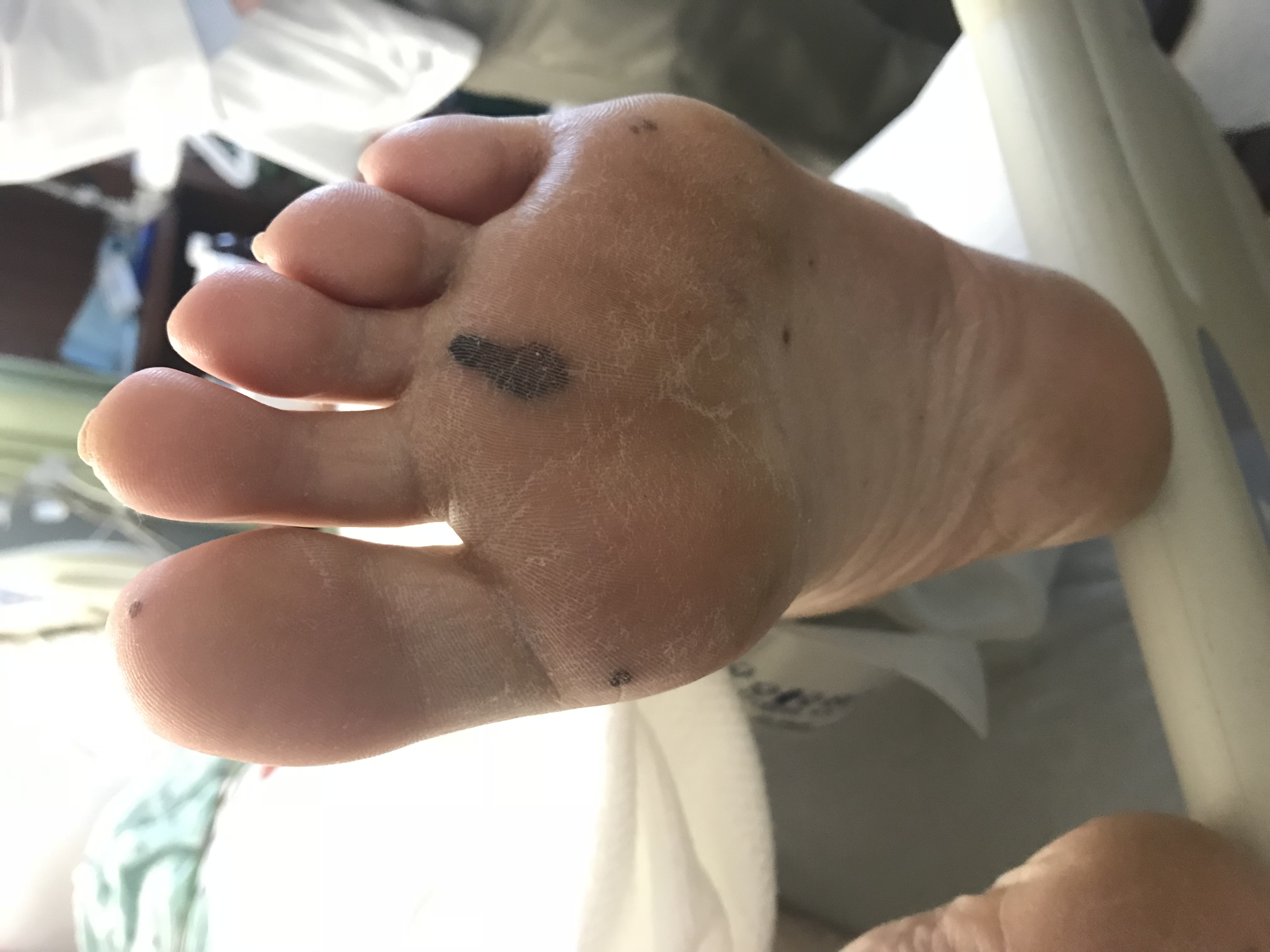 Case Presentation: A 39-year-old man presented with several days of worsening lightheadedness, fevers, and joint pains. His temperature was 99.8 Fahrenheit, pulse 122 per minute, and blood pressure 80/51 mmHg. He looked ill and uncomfortable. His palms and soles had multiple tender, purple-to-black macules and patches 3-30 mm in dimension, consistent with embolic infarcts (image 1). The left wrist and elbow were warm, swollen, and tender. No murmurs were audible. Blood cultures quickly grew methicillin-susceptible Staphylococcus aureus (MSSA). Multiple bilateral nodular densities were seen on chest X-ray, suggestive of septic pulmonary emboli. He had no other past medical history except a hospitalization after a major car accident in 2001. He did not use IV drugs.