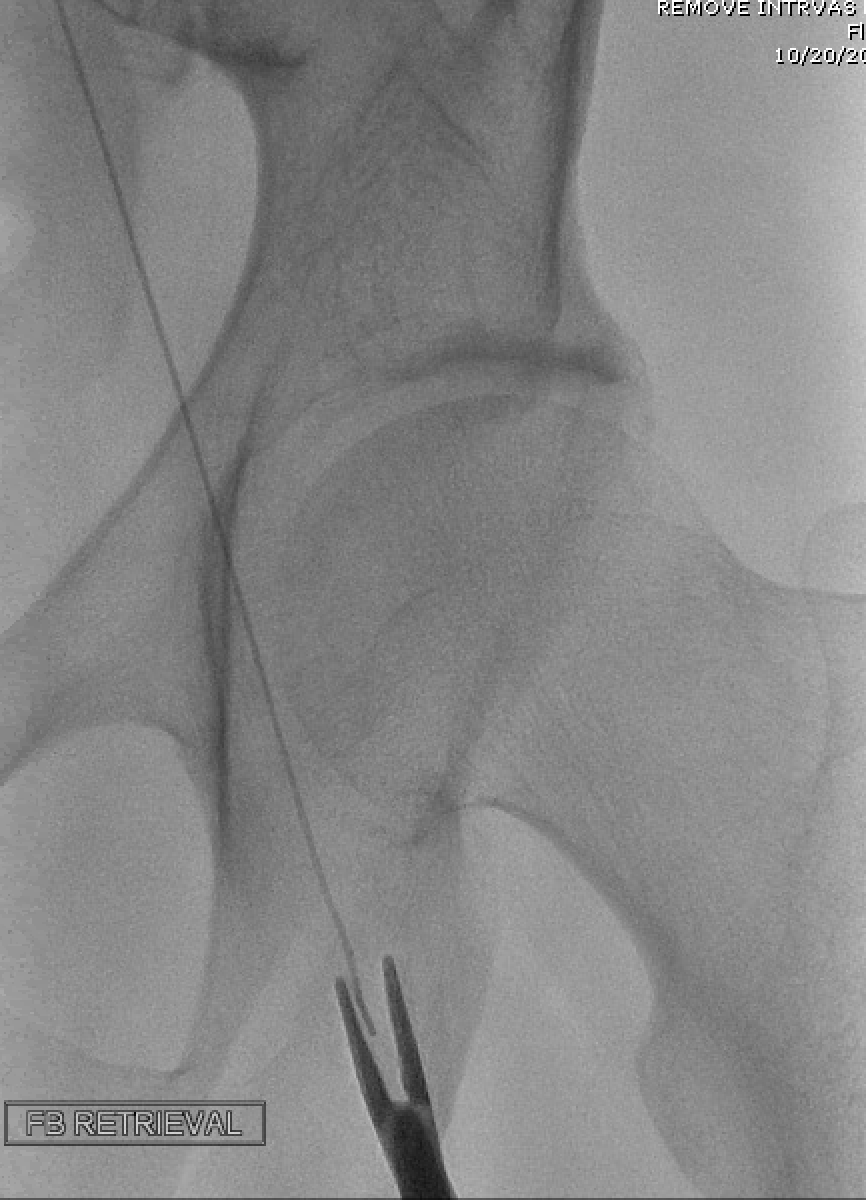 Despite appropriate antibiotics, he remained bacteremic. Suspicion for endocarditis was very high. On trans-thoracic and trans-esophageal echocardiograms (TTE and TEE, respectively), he had normal valves without vegetations, and a likely patent foramen ovale (PFO). Further imaging demonstrated a 40-cm-long metallic object running from his left femoral vein to the proximal IVC – likely a guidewire inserted and retained during treatment of his injuries in 2001. The patient underwent successful removal of the guidewire (image 2) and surgical treatment of multiple septic joints. Blood cultures subsequently cleared, and he was discharged with 6 weeks of intravenous antibiotics.
