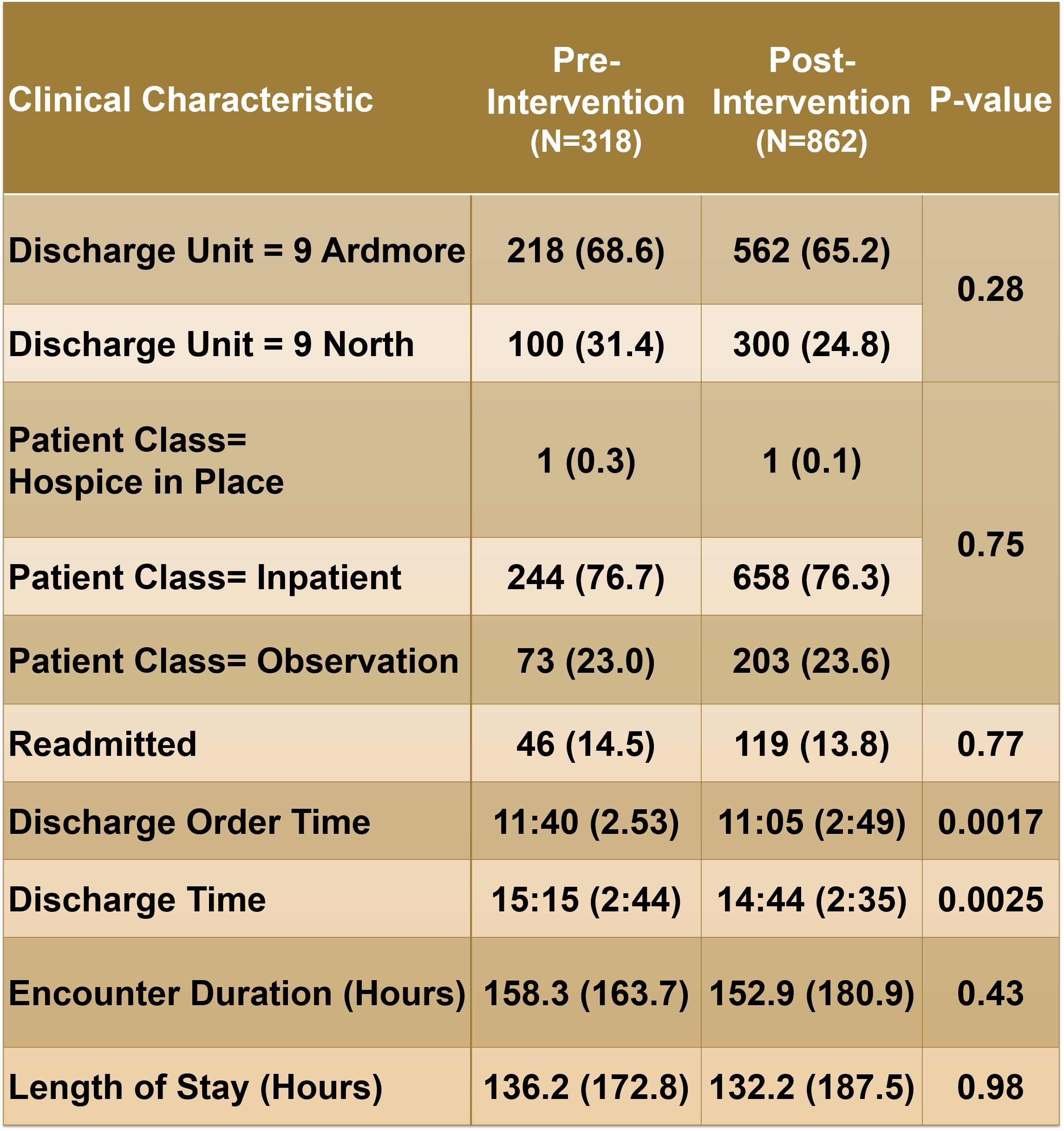 Methods: Lightening Huddle was introduced in November 2017 to provide a streamlined process for conducting discussions about plan of care and discharge. We performed SWOT analysis (Strengths, Weakness, Opportunities and Threat) involving all the key stakeholders on Hospitalist Units, including Physicians, Advance Practice Providers, Nursing, Care Coordination, Pharmacy, Administration and Care Navigation teams. We determined following major elements that were crucial for discharge planning: 1) Patient demographics (room number and name), 2) discharge status, 3) discharge disposition, 4) ability to transfer to discharge lounge or holding unit 5) barriers to discharge. By using a magnetic white board divided into five columns (Discharge status/ Disposition/ Safety to go to 5C/ Discharge Lounge/ Barriers) and a defined script, we aimed to limit the morning huddle to less than 10min for 38 bed unit, yet covering the important aspects of discharge planning. We compared pre- and post-intervention categorical outcomes with chi square tests and continuous outcomes with t-tests.