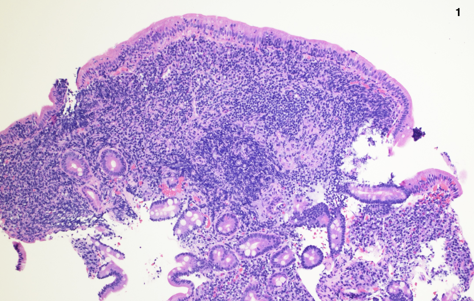 Case Presentation: A 56-year-old male with a past medical history of hypertension and diabetes presented to our gastroenterology clinic with dizziness, lightheadedness, and a feeling of being unwell since initiation of Losartan 3 months prior. Laboratory workup revealed normocytic anemia with a hemoglobin of 10.5 g/dL. He denied melena, hematochezia, abdominal pain, and changes in bowel habits. To rule out colorectal cancer and gastrointestinal (GI) bleeding, esophagogastroduodenoscopy (EGD) and colonoscopy were performed with biopsies. Visually, the esophagus, stomach, duodenum, and colon were unremarkable with no evidence of malignancy, inflammation or bleeding. Capsule endoscopy was also unremarkable. A subsequent iron panel revealed iron deficiency anemia (iron 38 mcg/dL, ferritin 20 ng/mL), and he was started on oral iron. Biopsies eventually showed villous blunting with inflammation in the first portion of the duodenum as well as foci of increased intraepithelial lymphocytes. Subsequent serological workup with tissue transglutaminase IgA ruled out celiac disease. Considering the negative workup and high suspicion for angiotensin type 1 receptor blockers (ARBs) induced enteropathy, the patient’s losartan was discontinued and, after six weeks, his anemia resolved.