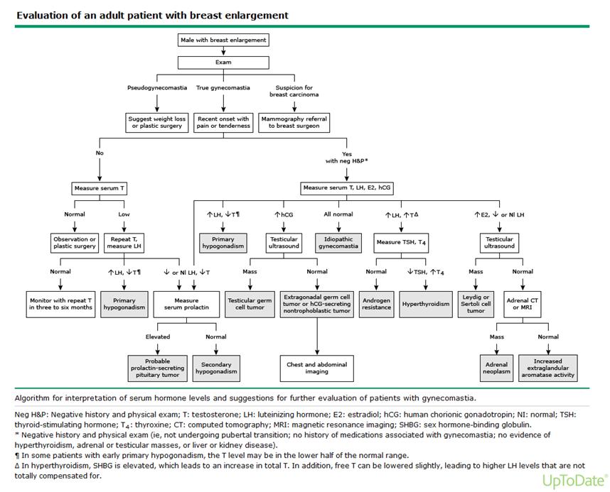 Case Presentation: A 55-year old man with a history of hypertension presented to the hospital with pleuritic left chest pain for 1 day and enlarging bilateral breasts for 2 months. Initial vital signs were notable for elevated blood pressure of 180/90 mmHg. Physical exam was remarkable for bilateral gynecomastia, areolar tenderness and testicular hypotrophy. Admission laboratory results showed normal troponins, elevated prolactin to 45.2 ng/ml, low levels of testosterone 109 ng/dL suggestive of androgen deficiency. Electrocardiogram revealed normal sinus rhythm. Testicular ultrasound did not show any mass and CT scan of the head was unremarkable. MRI of the brain showed a small 0.6 cm non-enhancing right pituitary microadenoma. Patient was started on cabergoline for elevated prolactin and the presence of pituitary microadenoma. Additional laboratory studies revealed normal levels of aldosterone, 17-hydroxyprogesterone, dehydroepiandrosterone; low levels of luteinizing hormone and follicle stimulating hormone. However estrogen level was noted to be markedly elevated at 134 pg/mL. MRI of the abdomen and pelvis was subsequently obtained which revealed a 6.3 cm heterogeneous right adrenal mass extending into the inferior vena cava. The patient’s clinical findings of feminization and adrenal mass with elevated estrogen were concerning for adrenal cortical carcinoma (ACC), specifically feminizing adrenal tumor (FAT). Laparoscopic right adrenalectomy was performed and histological study was consistent with ACC.